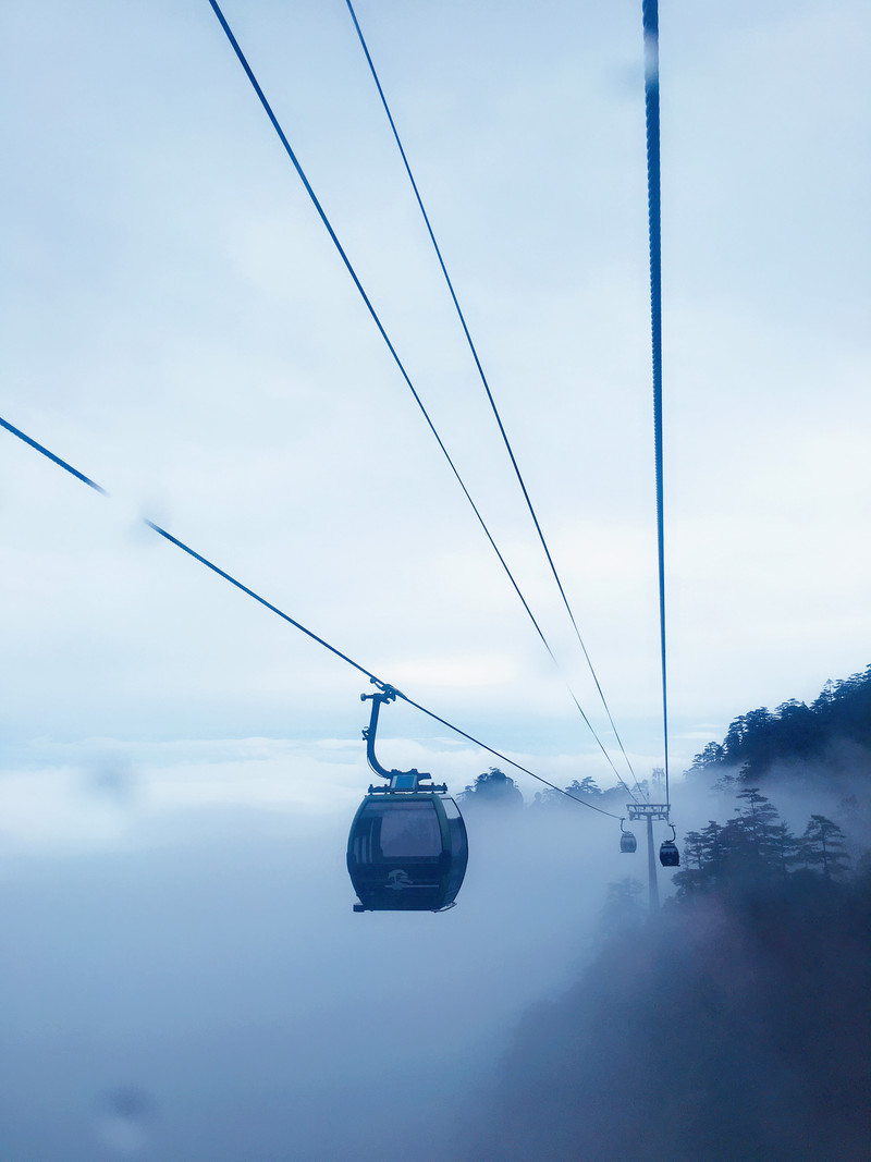 从慈光阁站上山,随着缆车上行,雾气渐浓,悠悠前行的缆车慢慢消失在大雾里,望不见玻璃之外的山景,看不到缆车下方的谷底,有些恐高的小伙伴反而比较安心。