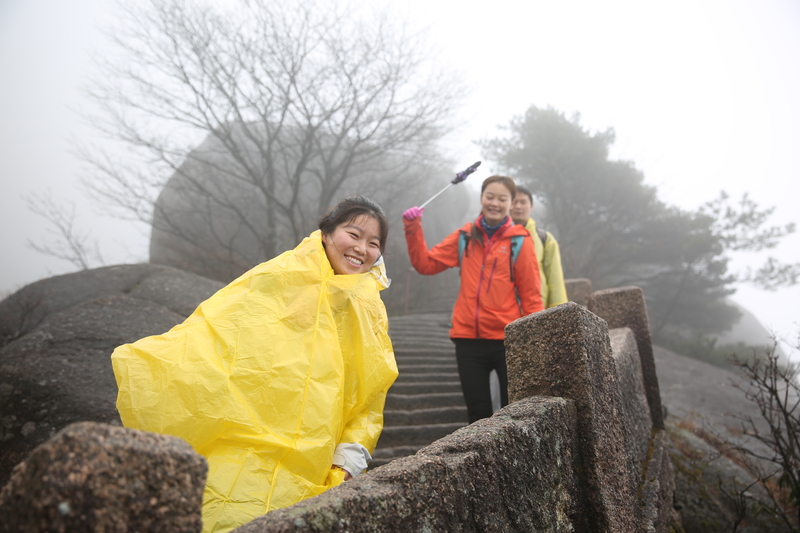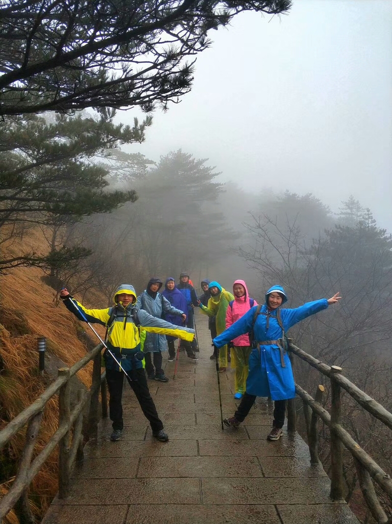 雨中黄山、雾中黄山,周六几乎是断断续续下了一整天的小雨,不能说不扫兴,大家走走停停,嬉嬉闹闹一路走过了雾蒙蒙的迎客松、雾蒙蒙的莲花亭、雾蒙蒙的百步云梯、雾蒙蒙的鳌鱼峰、雾蒙蒙的光明顶、最终抵达雾蒙蒙的北海。