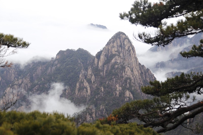 因为下雨,山上的雾气更浓,只能隐约望见迎客松的样貌,在心里想象它顽强生命力的美。