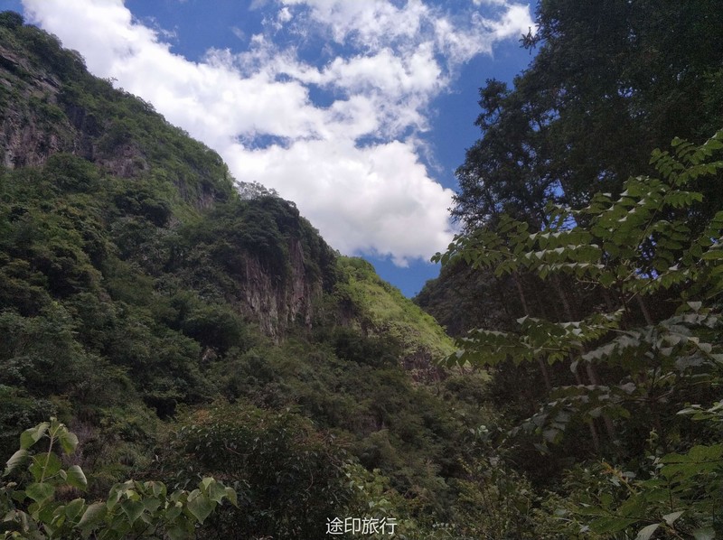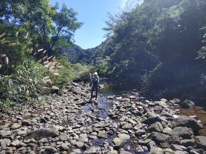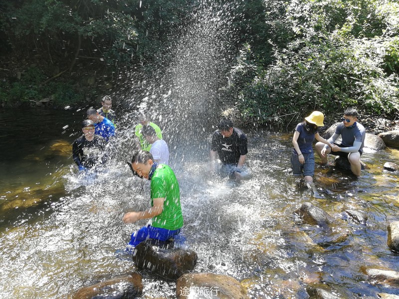 7.14早上由第一小组安排上午的行程,给出的计划8点出发,由于提前看了线路数据他们的判断吃完午饭可以走掉一半以上,然后交接给第二组开始安排。8:30左右抵达徒步起点刚下车就感受到了夏日的热情似火,真的挺热拍了一张集体照,开始出发了,刚进入峡谷由于一段时间没下雨,峡谷中也没什么水流,说好的来溯溪的不是吗,路上是无情的调戏第一组领队“领队我们要玩水,走不动了”来看下领队是如何应对“客户们”的需求的。一直做了大概1个多小时终于看到了一处水池,大家也迫不及待的想下水玩了,玩了大半个小时继续出发,上午的路多特别好走 爬升不多,不由得让大家感觉这线路也太简单了吧,中午11点多领队给我们安排了吃午饭的地方,在午饭的下面就是一处特别清澈的水池,可以游泳、可以跳水、这里大家休息了近2小时,第二组接棒安排的出发时间13点整。