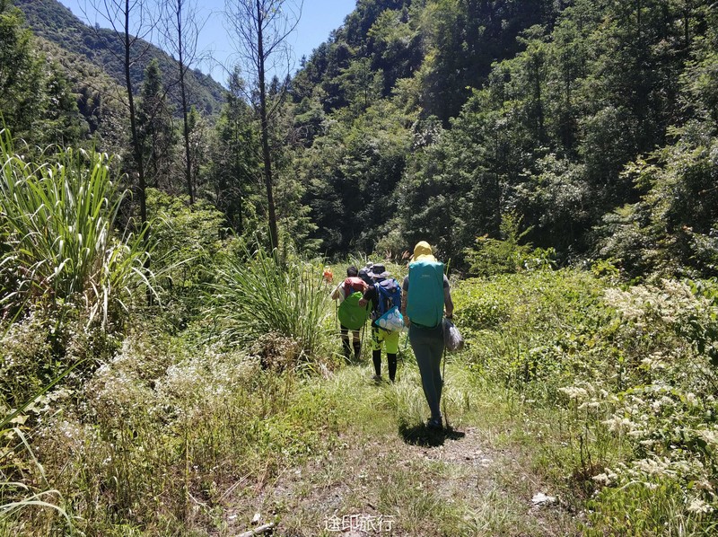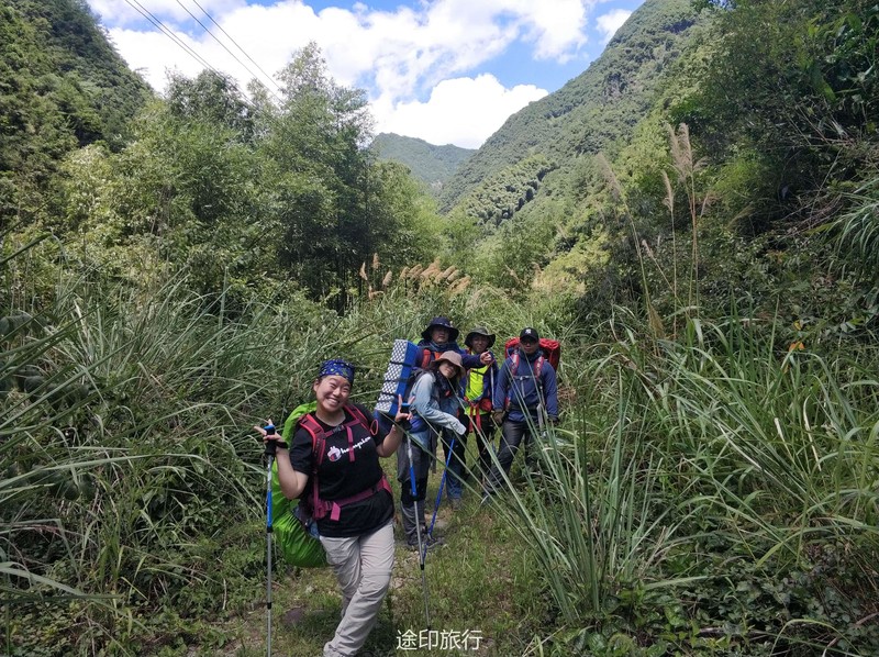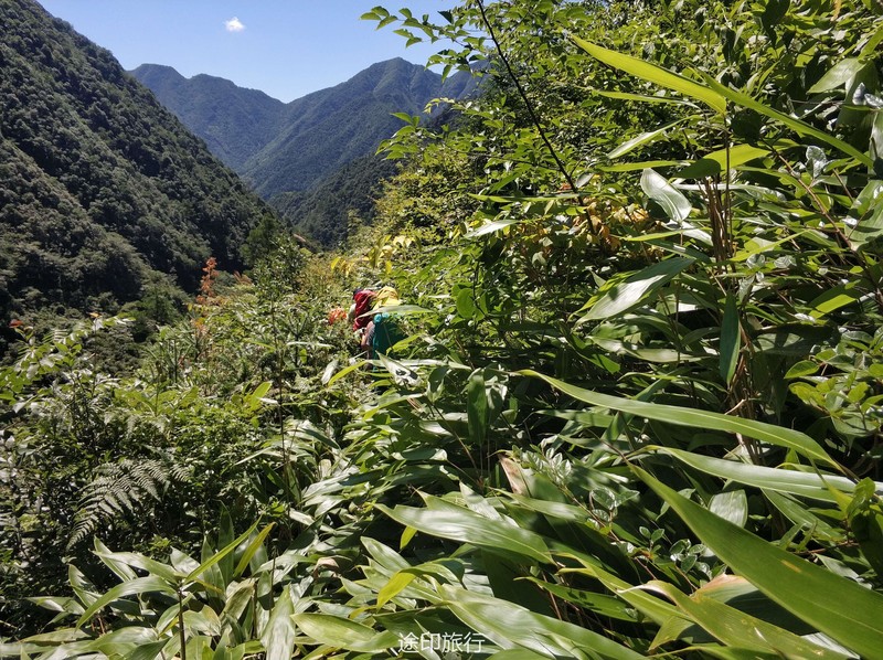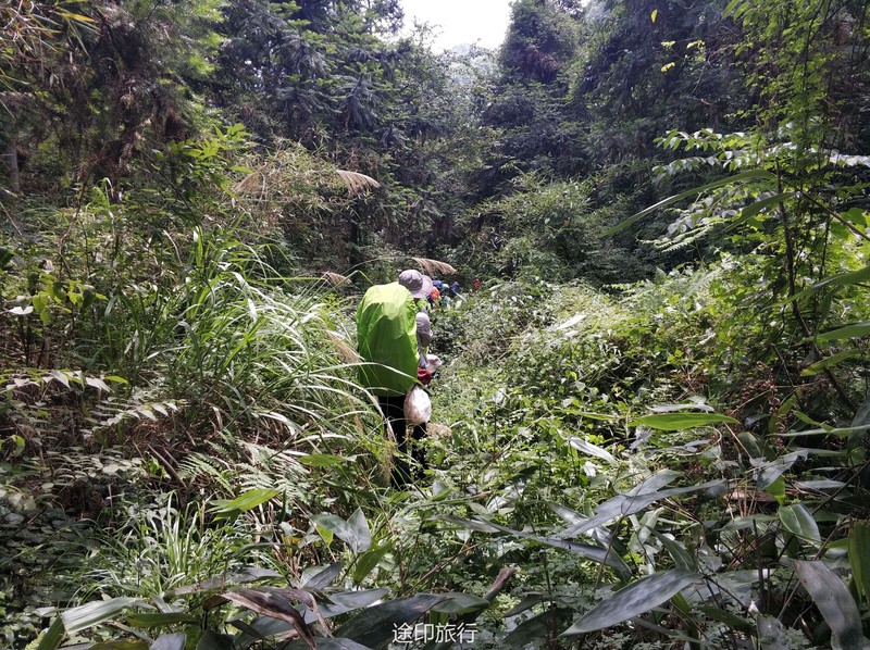7.15号早上第三组接管,安排今天出发时间8点,早上先做了一个热身舞蹈操,今天刚出发路就非常不好走,路面的宽度在20-30公分左右,一路上都只能一个人同行,经常还要低头躲避倒下的树枝,还要注意不要丢下左边的峡谷,当我们离开了树林更苦的日子来了,走进了矮竹林中我们基本是暴露在大太阳下,走起来特别热,明显感觉比昨天要热很多,就这样大概走了1小时这样的路,终于眼前突然路变宽了,我们走出了竹林,来到了河谷的下游,先行探路的领队已经为我们找好了一处水源可以让大家休息一会,抵达这里我们离终点已经不远了,之后的路也都是康庄大道了,半小时后我们抵达了村中,这次要求所有的垃圾都要带下山,也不在山里做燃烧处理。