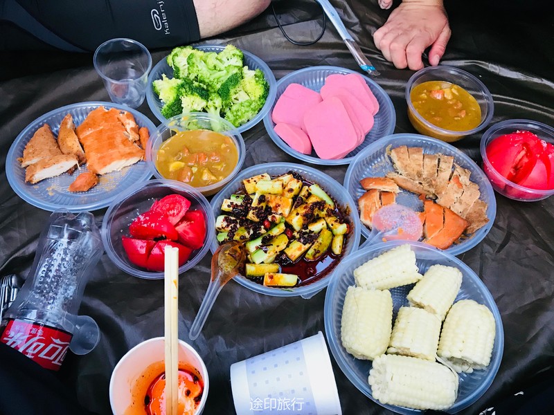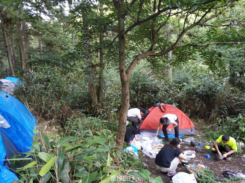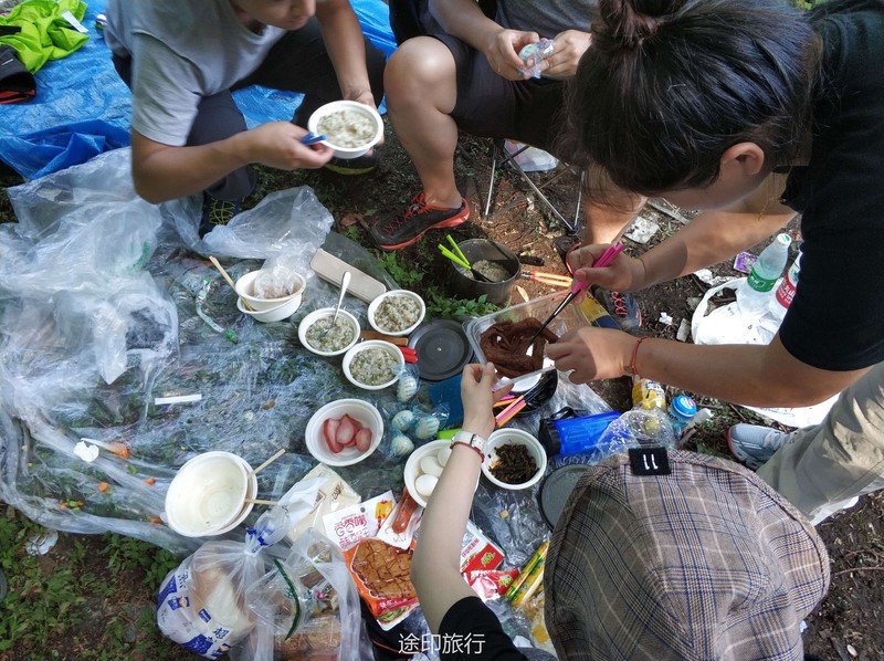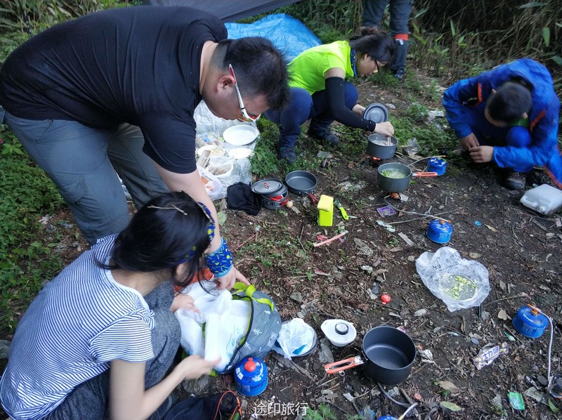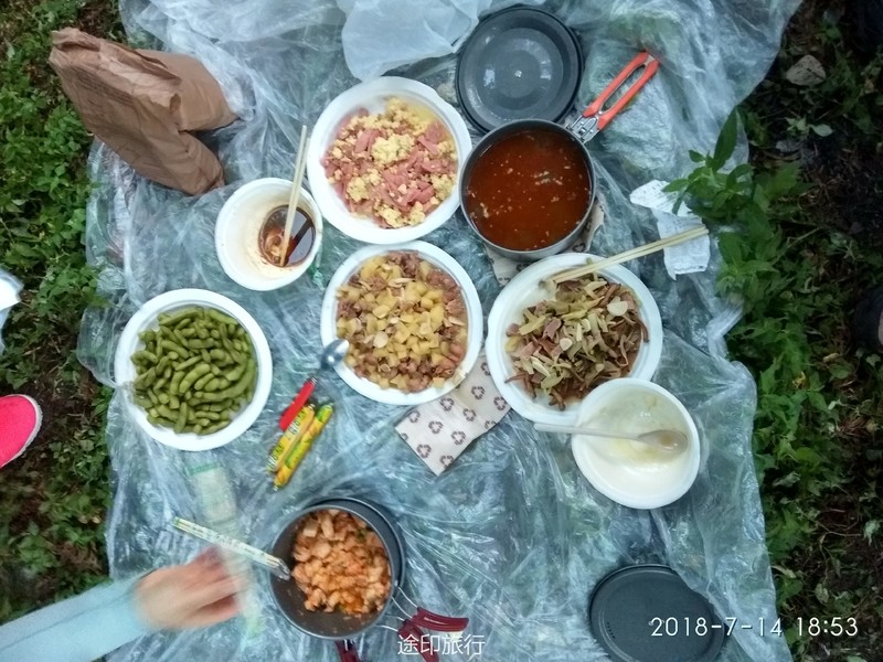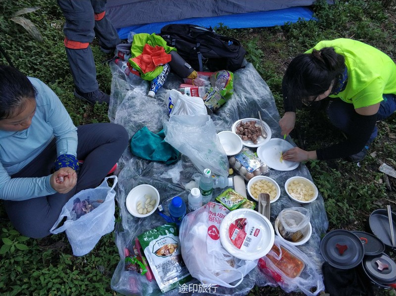 最终全队17:30抵达了营地,先到营地的队员已经刚开始准备做饭了,在这里我真的要吐槽一下,营地的垃圾真的太多了,呼吁一下大家请带走自己的垃圾,留一片金山银山给后人,辛苦了一天大家都等着这顿美食了,这次晚餐我加入了第三组晨晨小组,不得不说真的是选对了,我们小组的晚饭也太好吃了,也感谢我们这次的大厨绯绯,其他小组也各有特色,第二组被称为坦克组他们组的背负能力确实不错,还带了水果罐子、哈密瓜、咖啡、奶茶、红酒,谁让别人有能力嘚瑟那。晚上的山里天气非常好,能看到萤火虫,还有就是满天的星星,好久没有感受这样的生活了(没有信号,不用被手机困扰)。