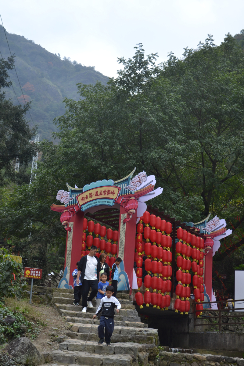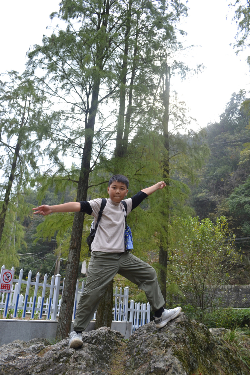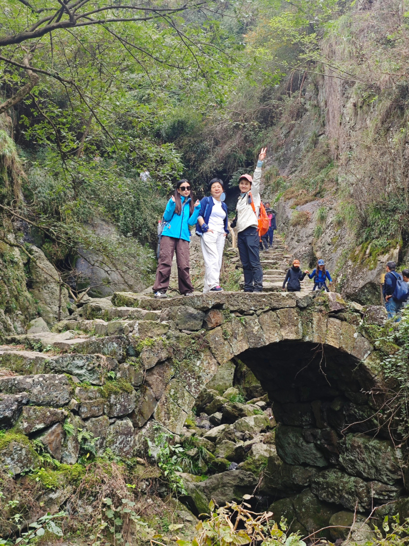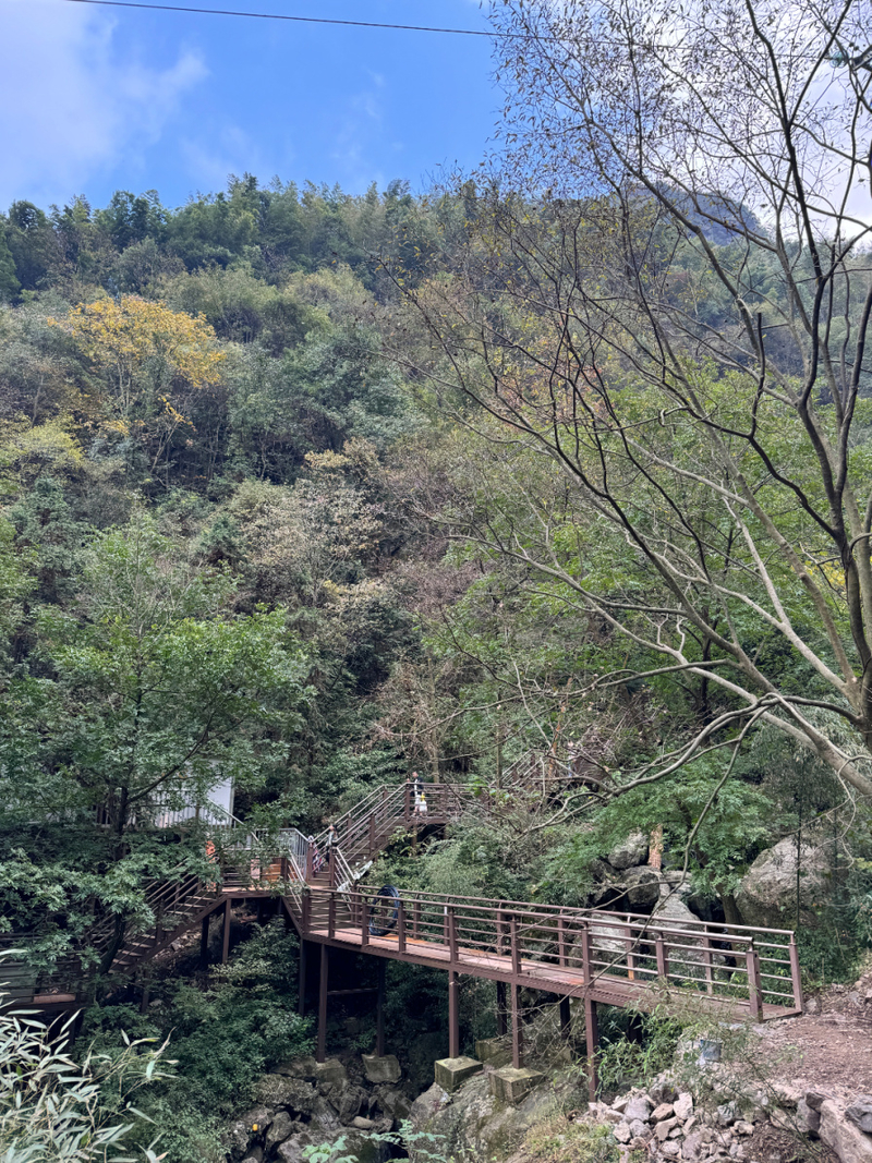 在水杉林里停留了许久,我们才恋恋不舍地踏上了下山的路。沿着古道下山,脚下是天然石块砌成的台阶,高高低低,仿佛在诉说着岁月的故事。先是经过水库上的桥,观景台、瀑布、石桥,一路上,山峰相叠,山石相迎,翠绿的山峦与奇形怪状的石头相互映衬,形成了一幅天然的山水画卷。