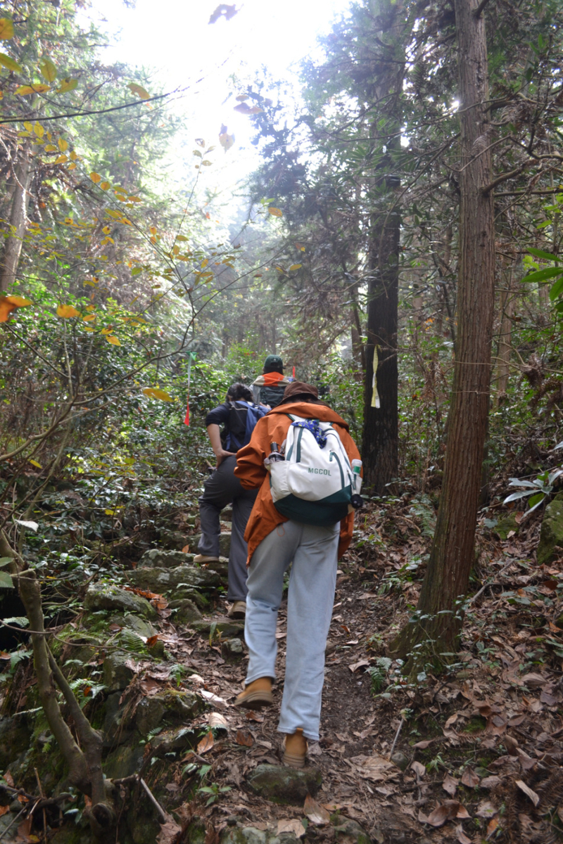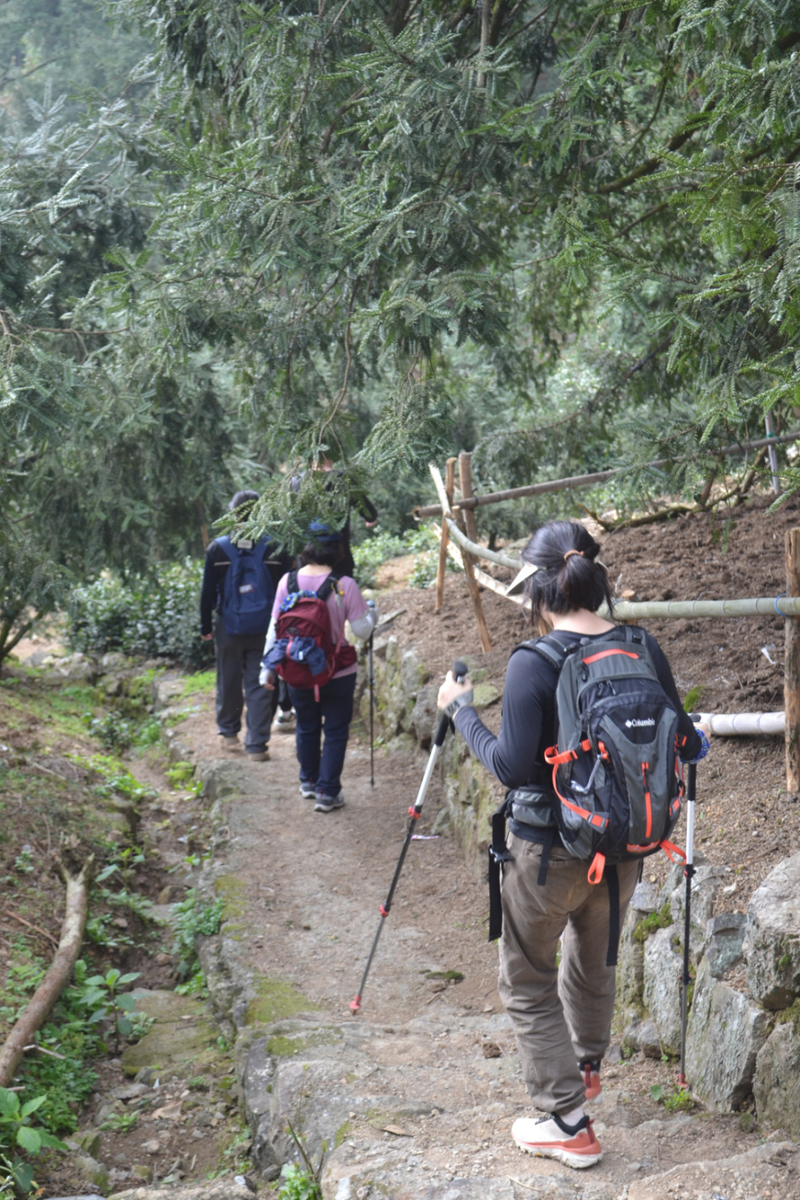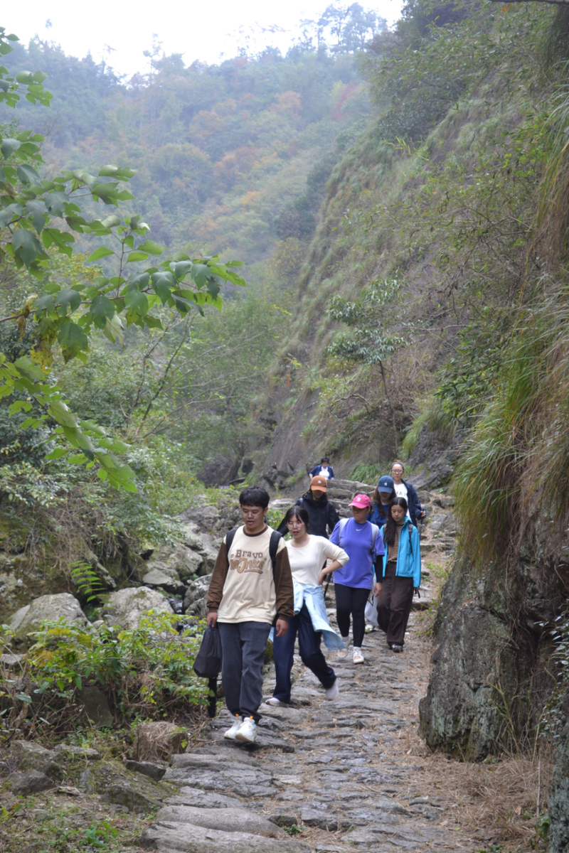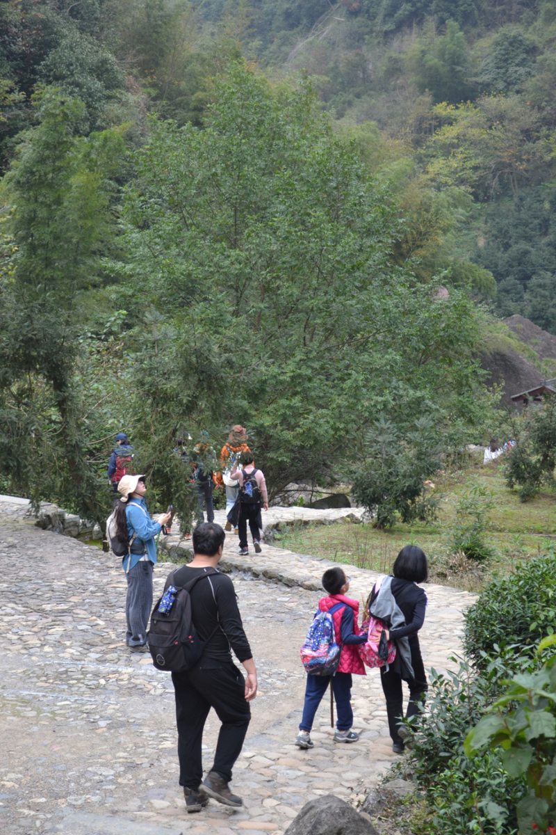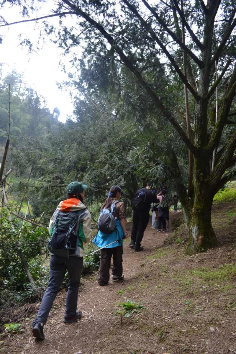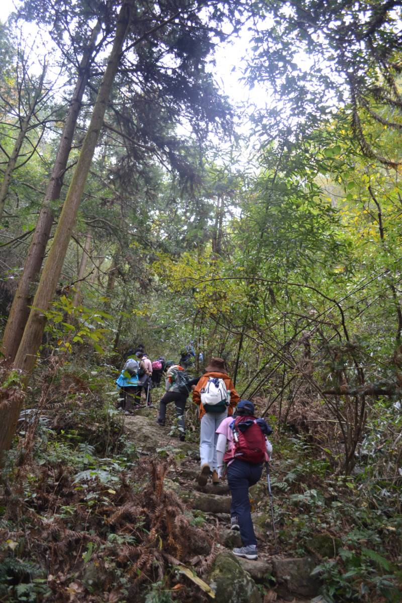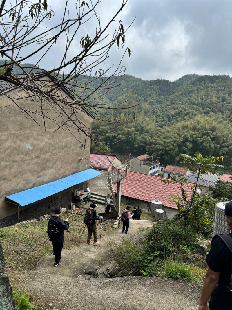这次我们是走的反穿路线,先走不规整的石头山路,经过农家、树林、竹林,随后来到古树的香榧林,这里视野已经开阔了。相比这段的下山,上山的路相对轻松一些,但也需要小心谨慎,因为有些路段比较陡峭。到了山顶后,我们在这短暂休息,远眺远处的风景。