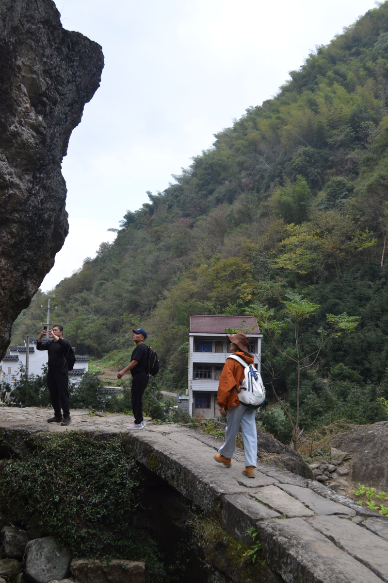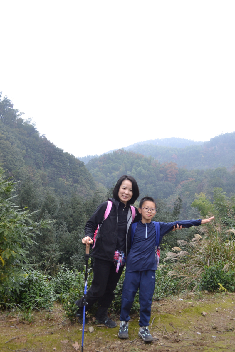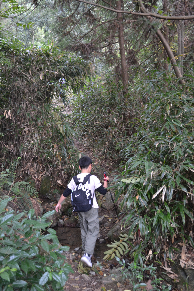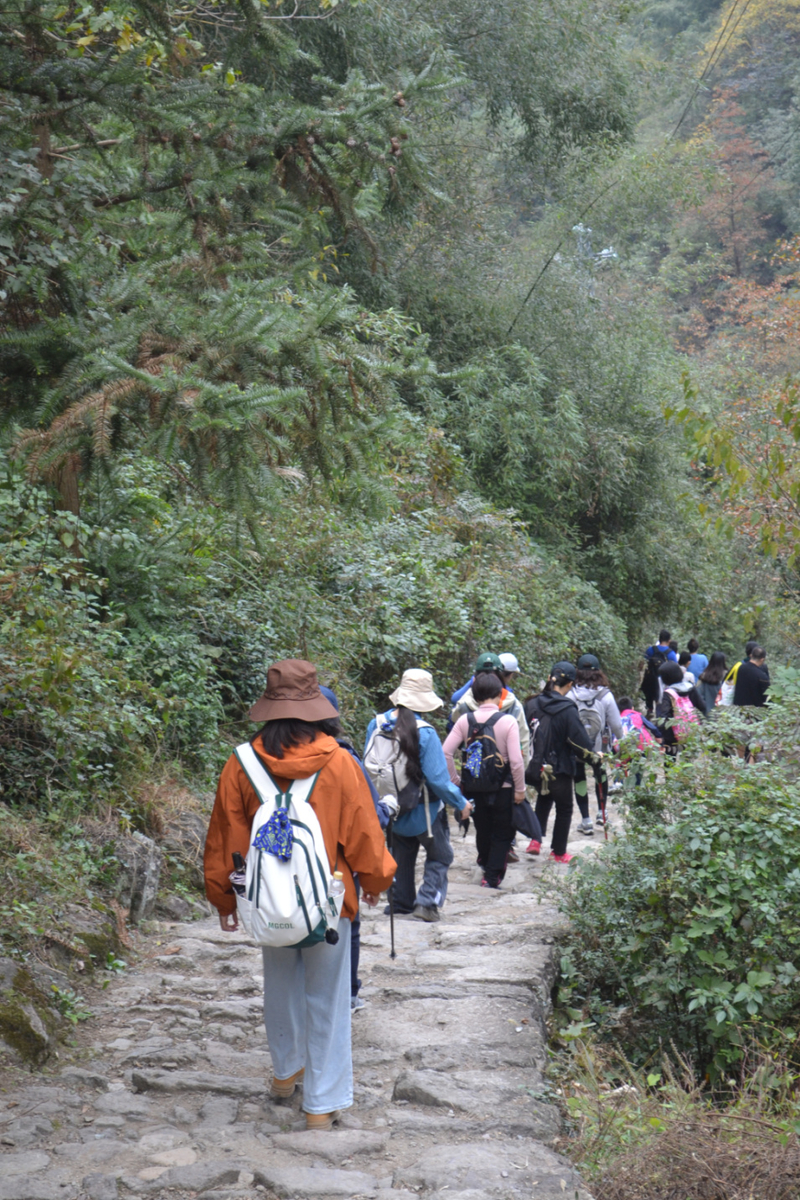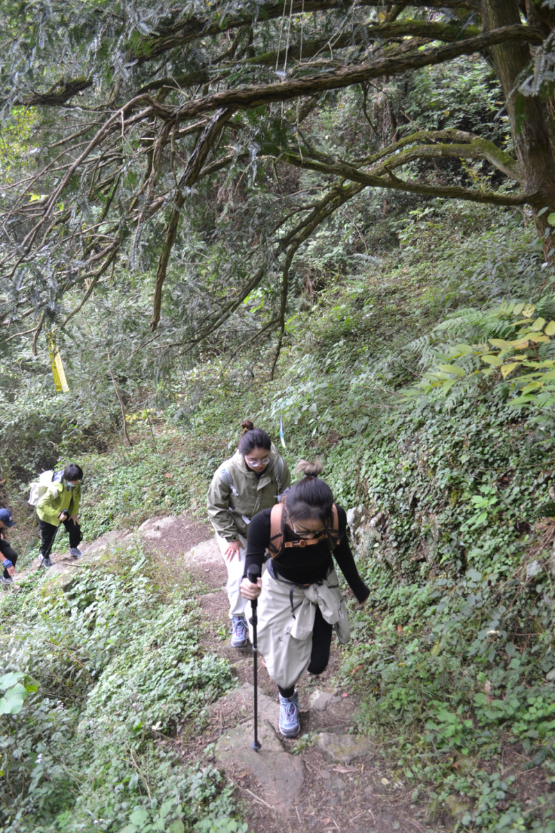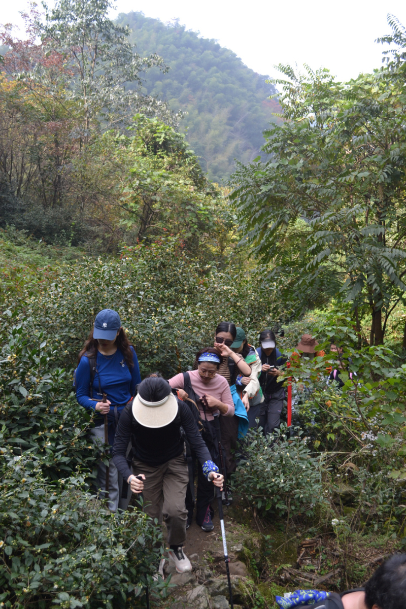 这次我们是走的反穿路线,先走不规整的石头山路,经过农家、树林、竹林,随后来到古树的香榧林,这里视野已经开阔了。相比这段的下山,上山的路相对轻松一些,但也需要小心谨慎,因为有些路段比较陡峭。到了山顶后,我们在这短暂休息,远眺远处的风景。
