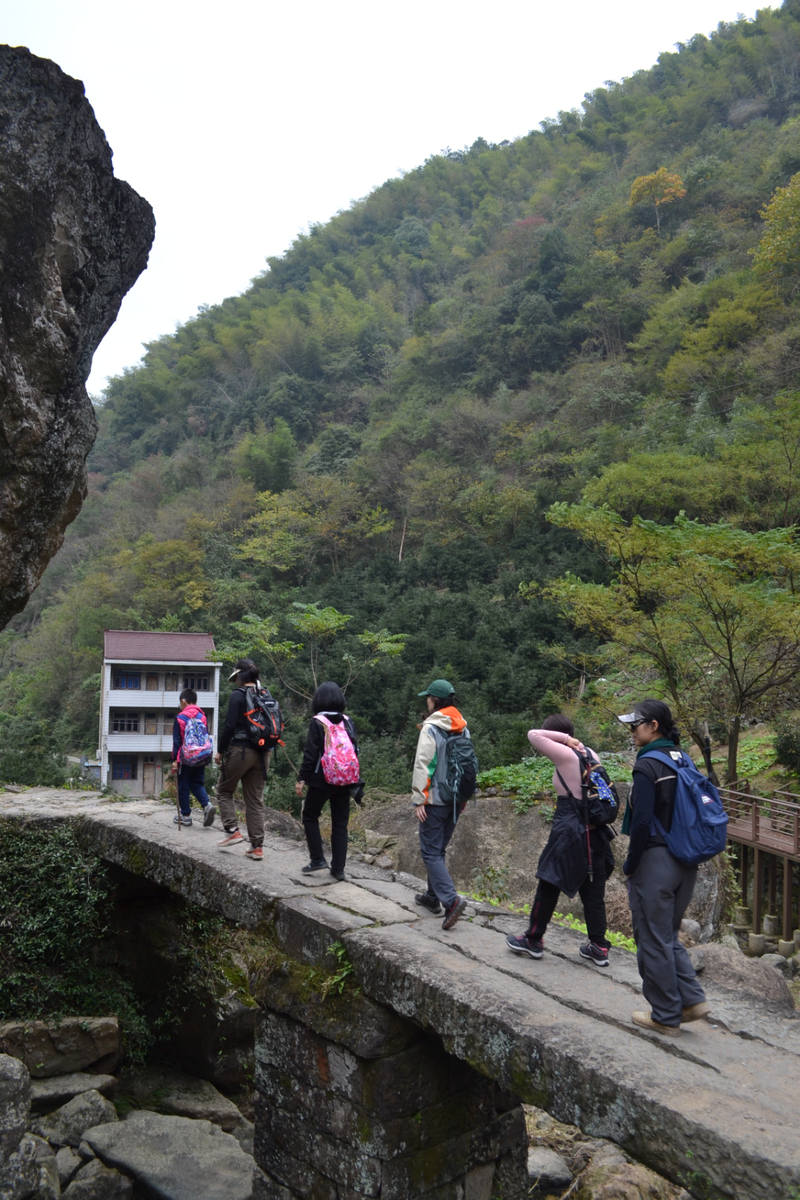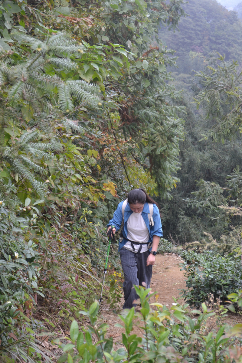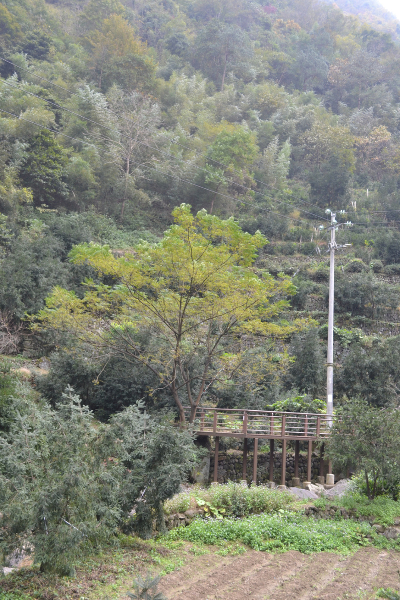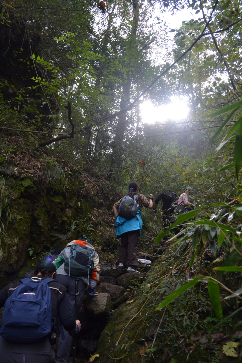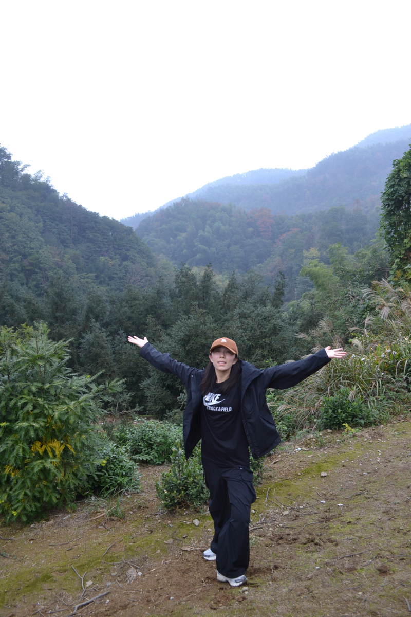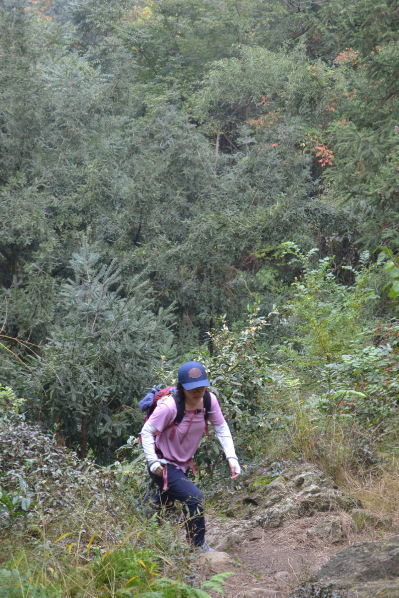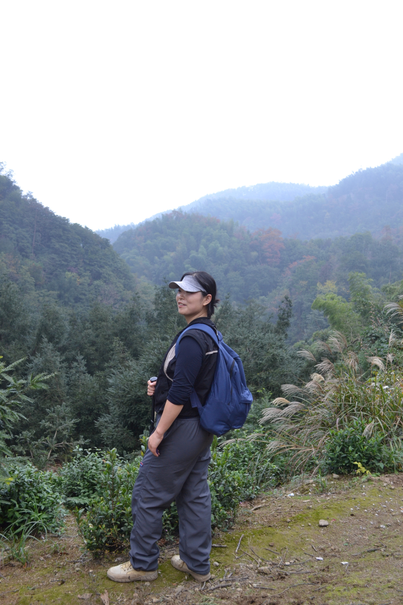 这次我们是走的反穿路线,先走不规整的石头山路,经过农家、树林、竹林,随后来到古树的香榧林,这里视野已经开阔了。相比这段的下山,上山的路相对轻松一些,但也需要小心谨慎,因为有些路段比较陡峭。到了山顶后,我们在这短暂休息,远眺远处的风景。
