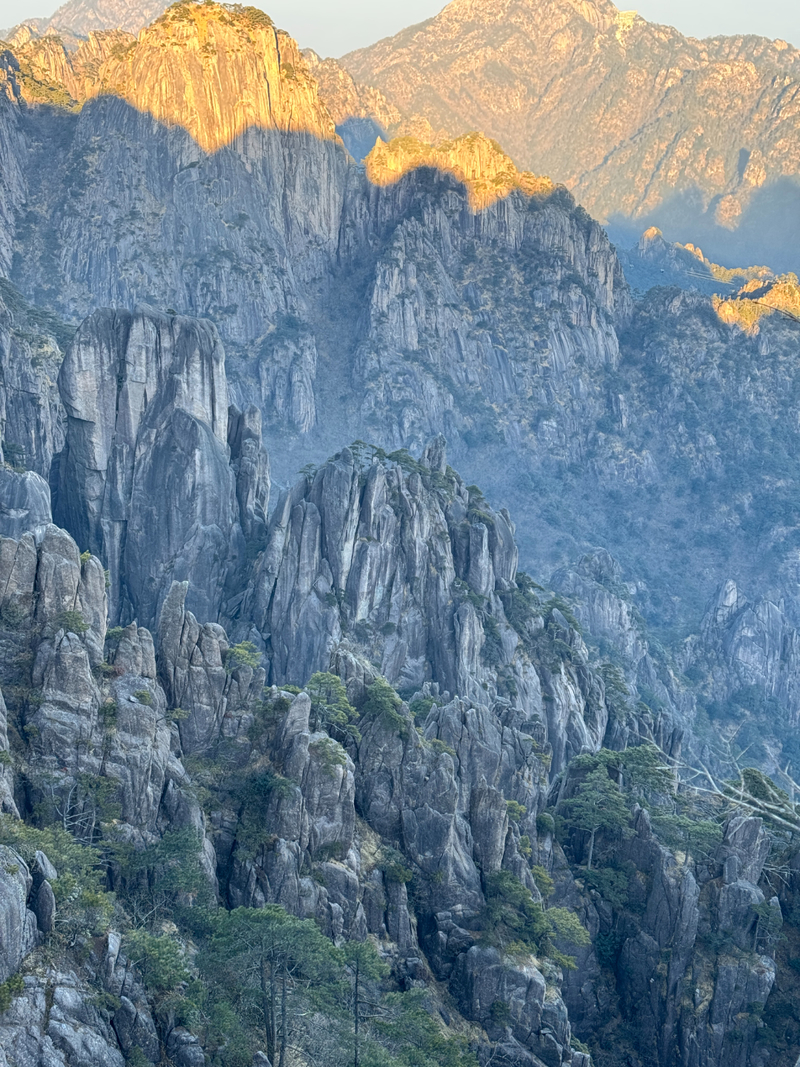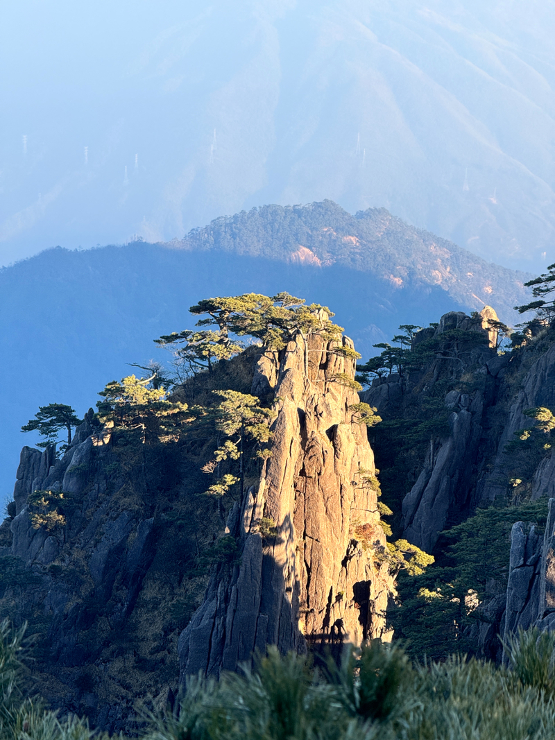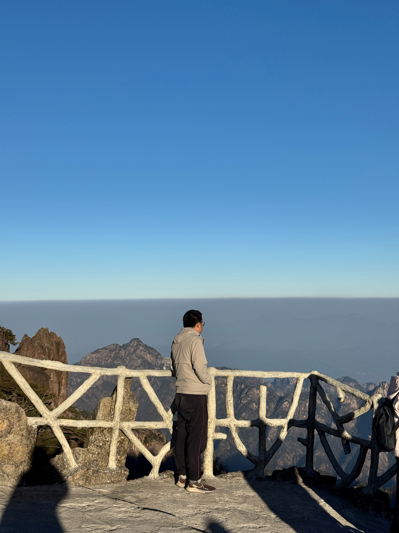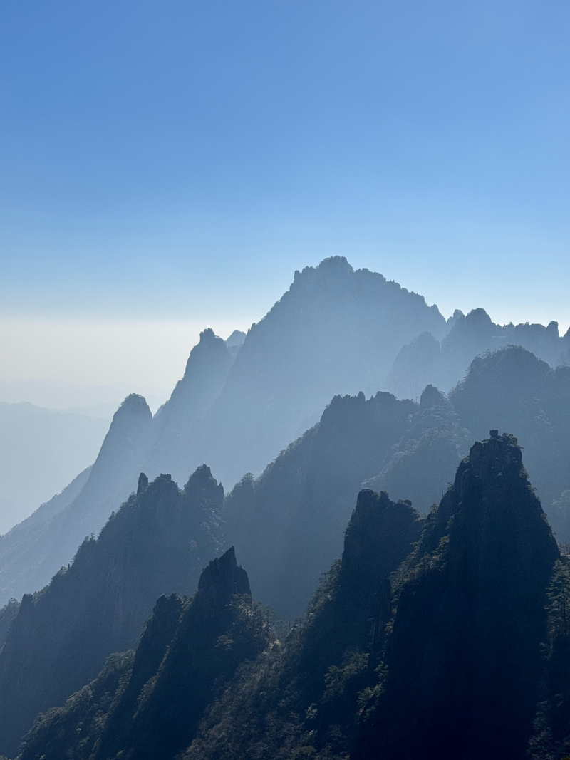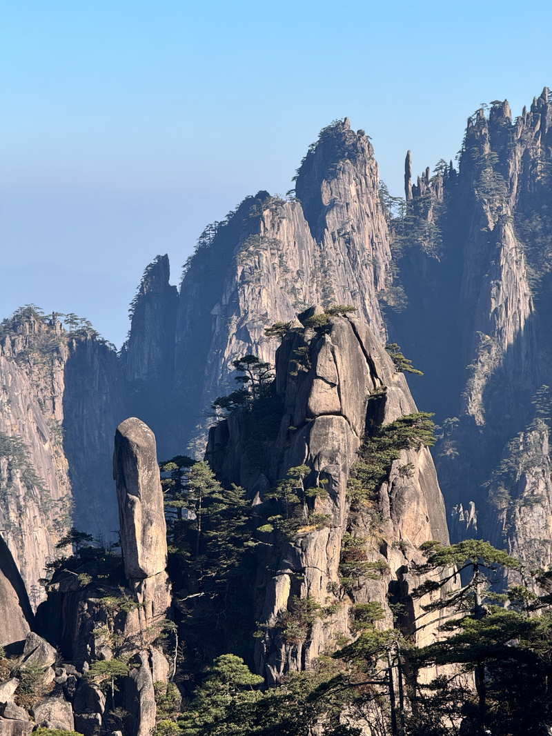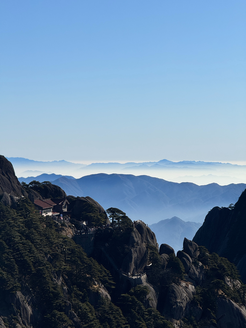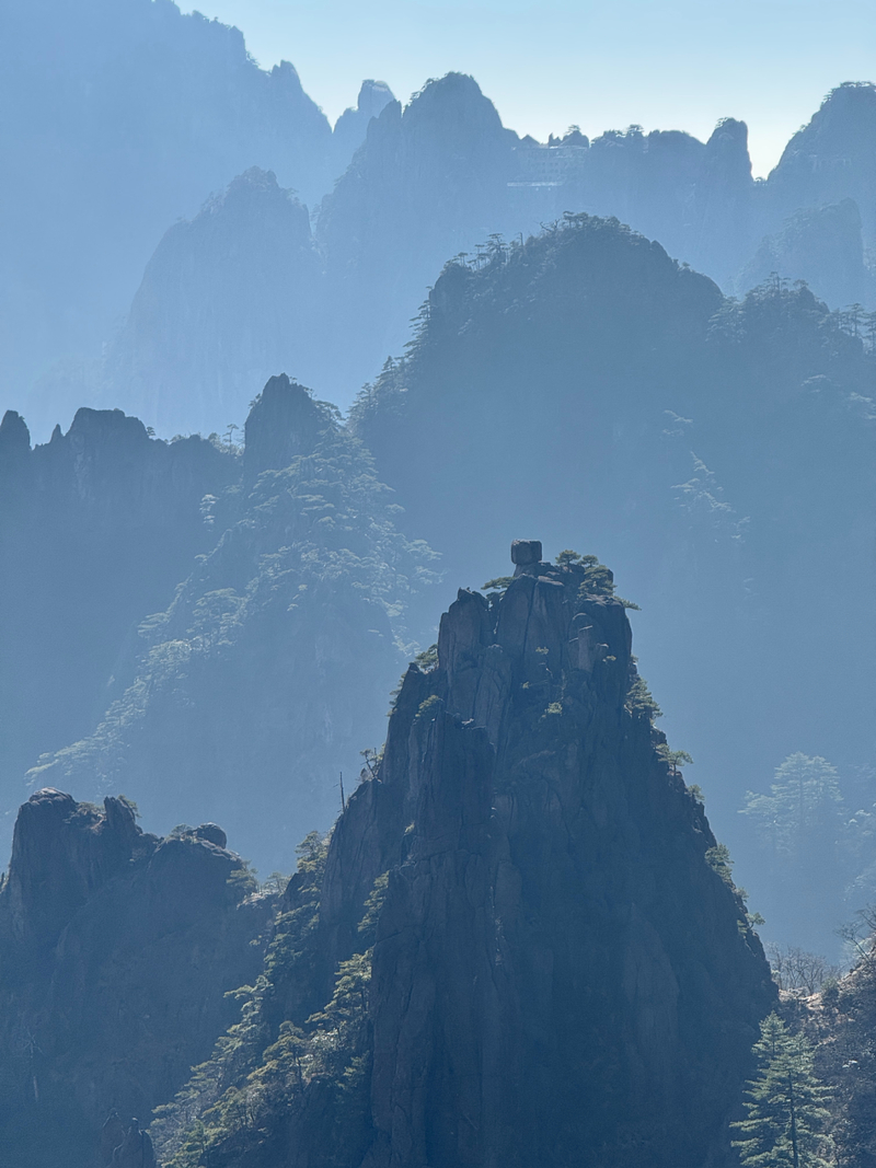 看完日出,简单吃了早饭收拾好,我再次出发前往光明顶。此时的光明顶与昨晚相比,又是另一番景象。阳光明媚,视野更加清晰,远处的山峰连绵起伏,仿佛一幅巨大的山水画卷。从光明顶下来,我们途经白云宾馆,来到鳌鱼峰观景台。远看鳌鱼峰的雄伟,以及远处的美景。走过鳌鱼峰,便是垂直坡度较大的下山路,由于周末上山的人很多,更加导致了下山要谨慎。走过后回头看,更是陡峭。来到百步天梯更是人多到及其拥堵,我们小心翼翼地沿着台阶向上走。但在攀登的过程中,也能欣赏到独特的风景。两侧的山峰陡峭如壁,岩石纹理清晰可见,让人不得不佩服大自然的神奇力量。期间远处眺望,看到水墨黄山奇景,层次交叠,又通透。