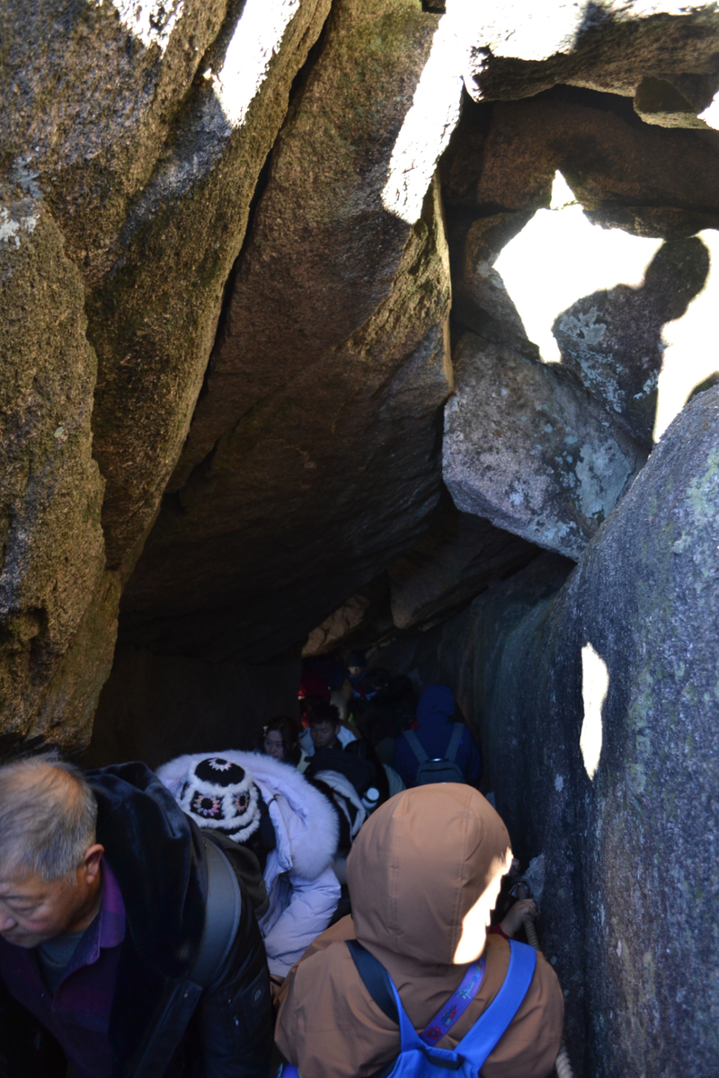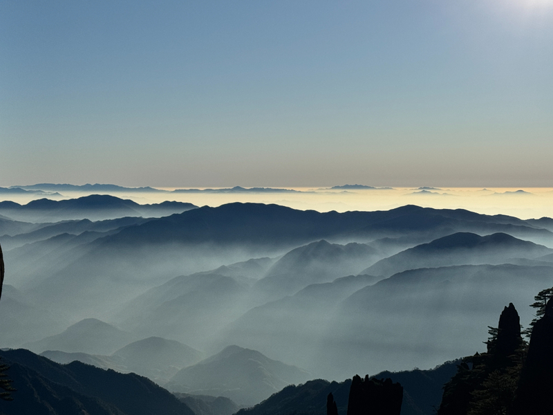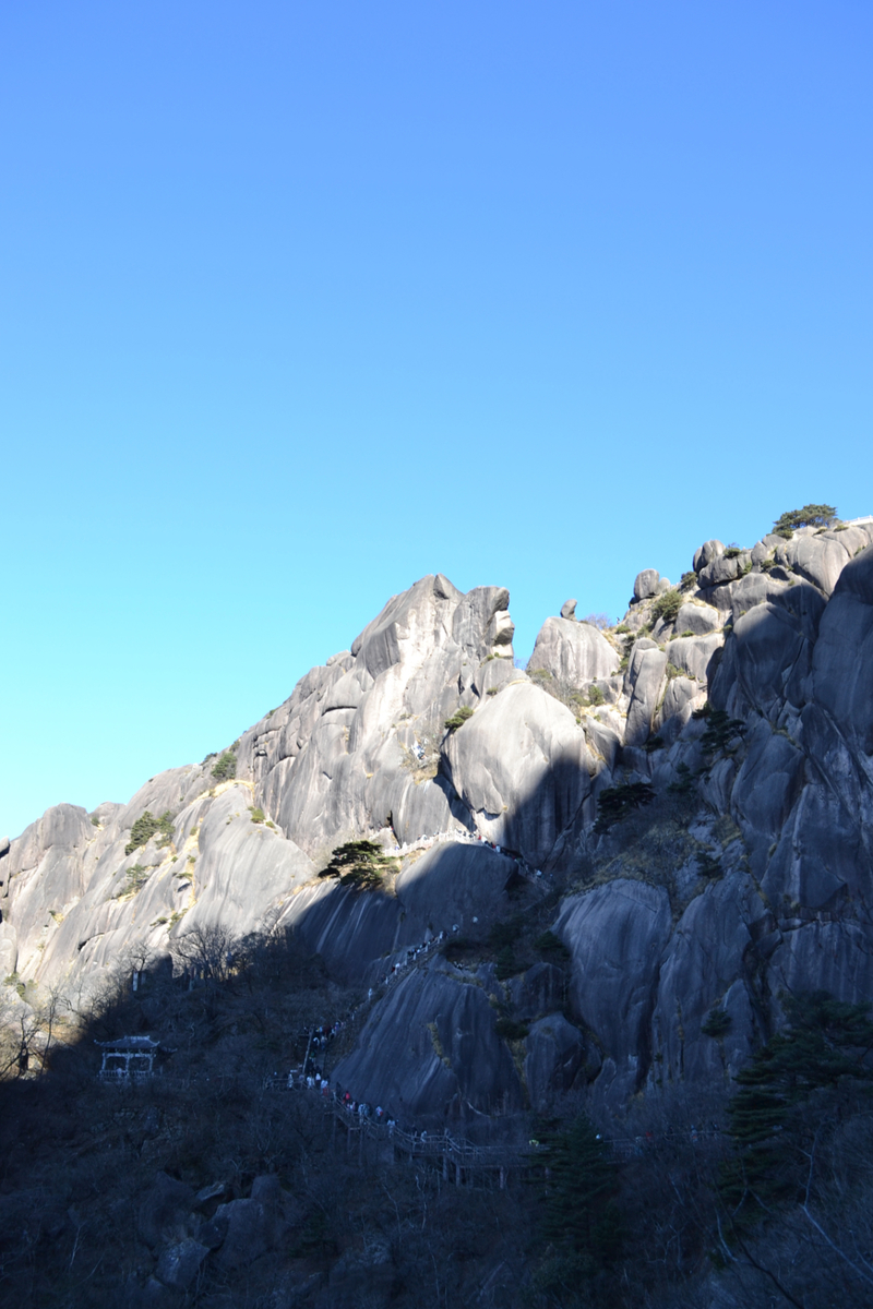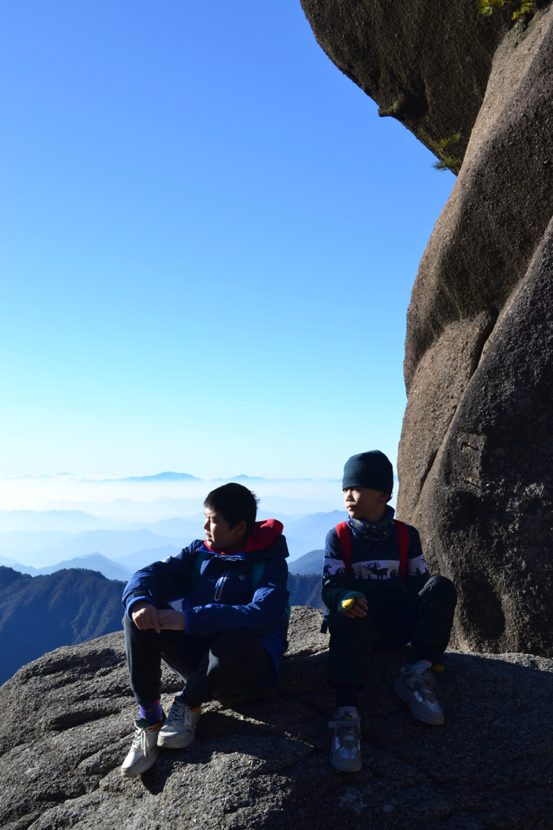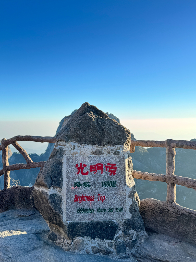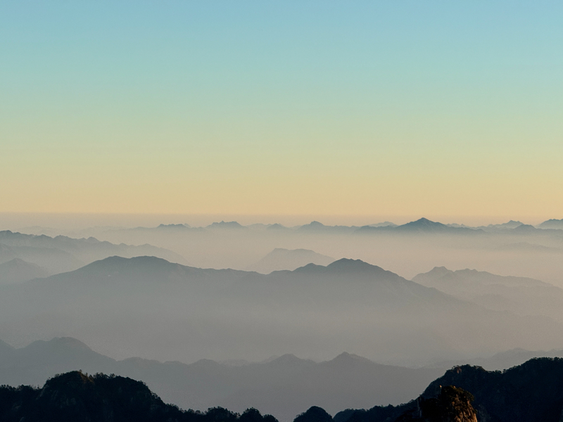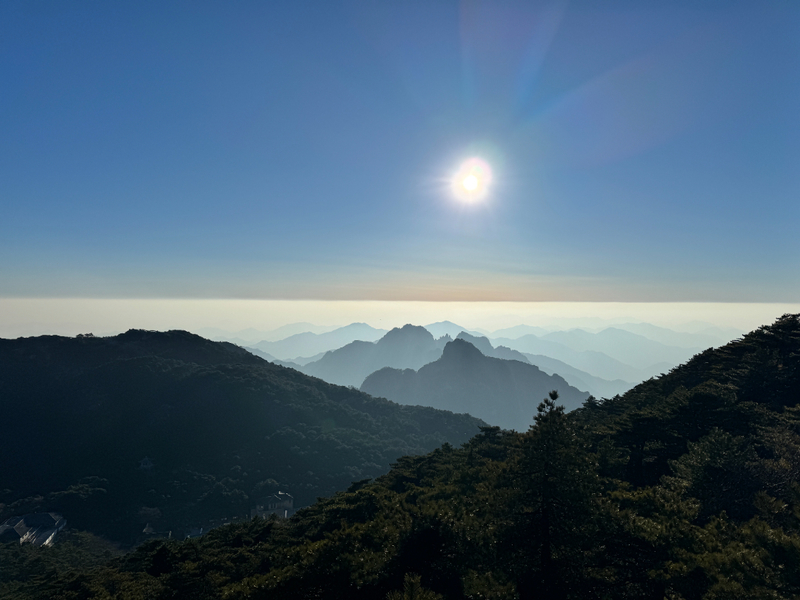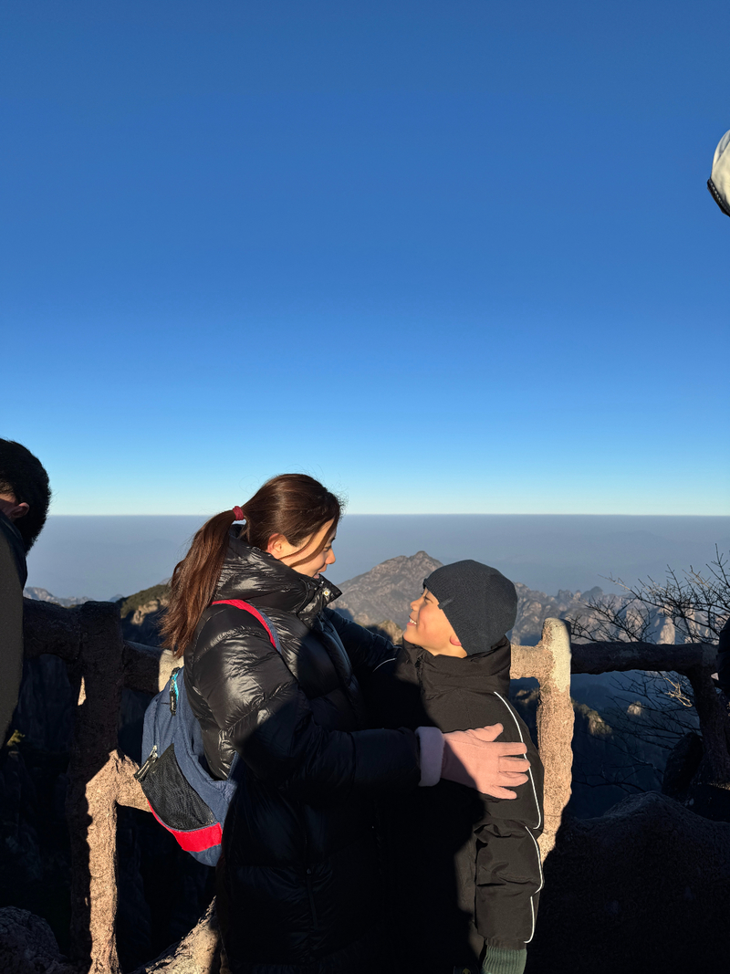 看完日出,简单吃了早饭收拾好,我再次出发前往光明顶。此时的光明顶与昨晚相比,又是另一番景象。阳光明媚,视野更加清晰,远处的山峰连绵起伏,仿佛一幅巨大的山水画卷。从光明顶下来,我们途经白云宾馆,来到鳌鱼峰观景台。远看鳌鱼峰的雄伟,以及远处的美景。走过鳌鱼峰,便是垂直坡度较大的下山路,由于周末上山的人很多,更加导致了下山要谨慎。走过后回头看,更是陡峭。来到百步天梯更是人多到及其拥堵,我们小心翼翼地沿着台阶向上走。但在攀登的过程中,也能欣赏到独特的风景。两侧的山峰陡峭如壁,岩石纹理清晰可见,让人不得不佩服大自然的神奇力量。期间远处眺望,看到水墨黄山奇景,层次交叠,又通透。