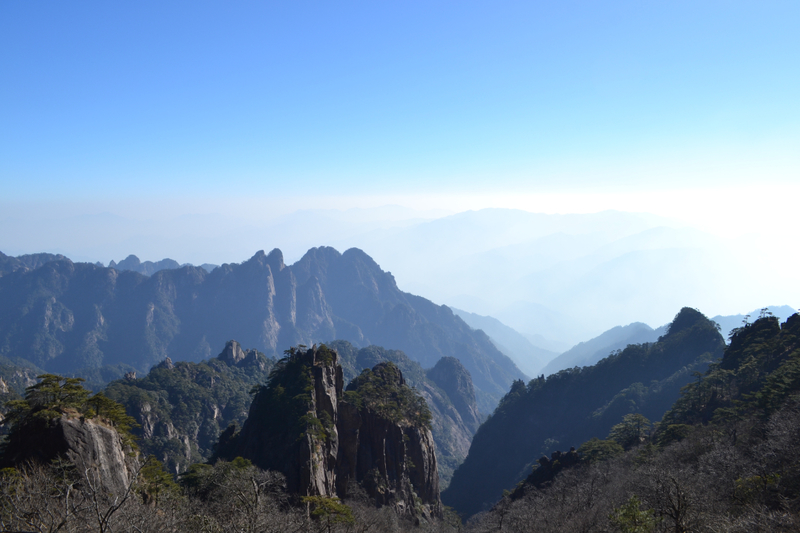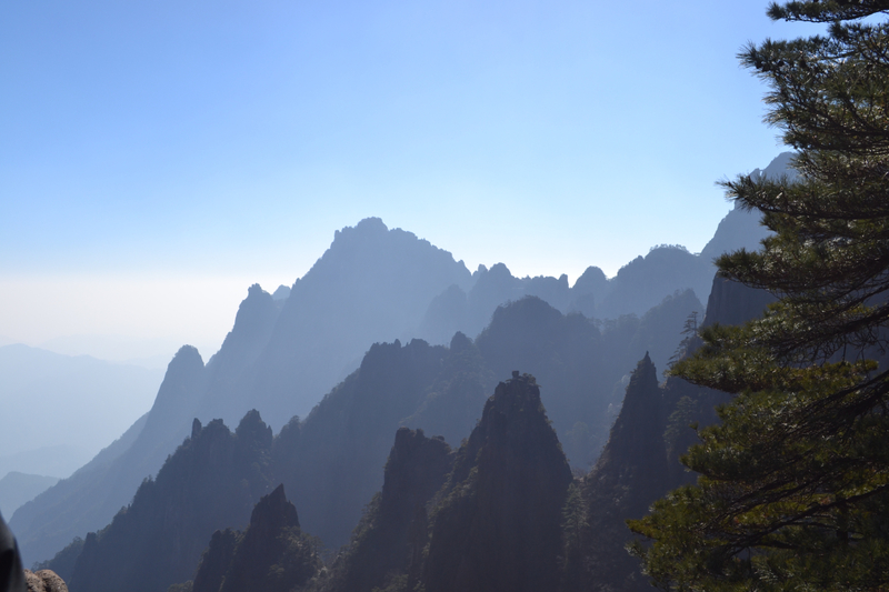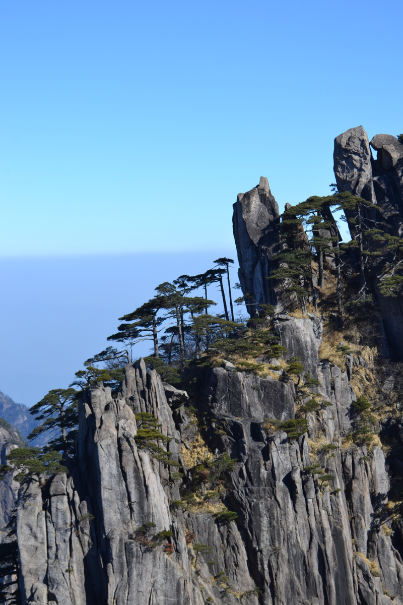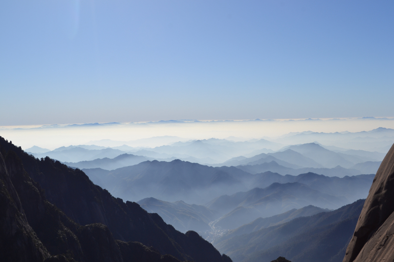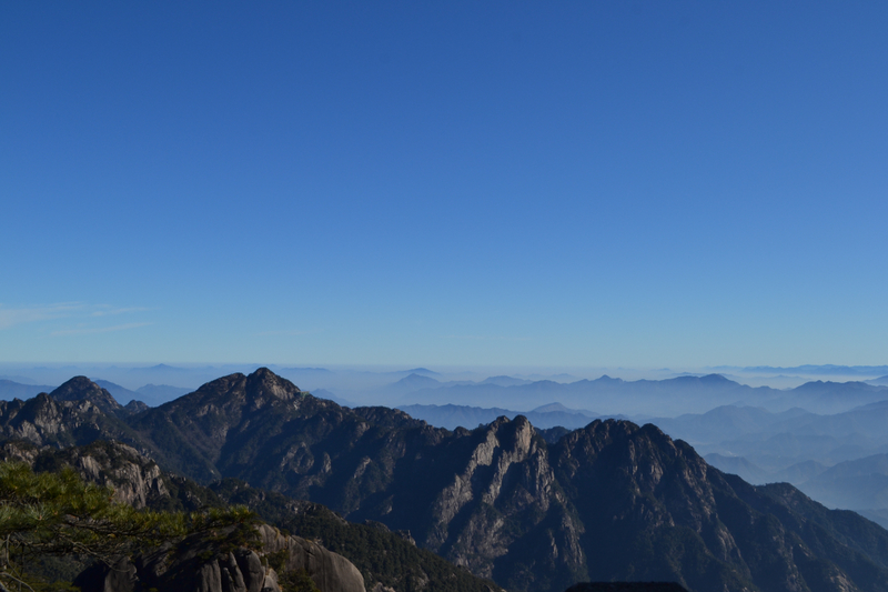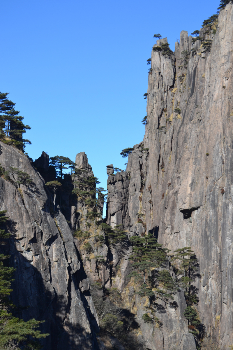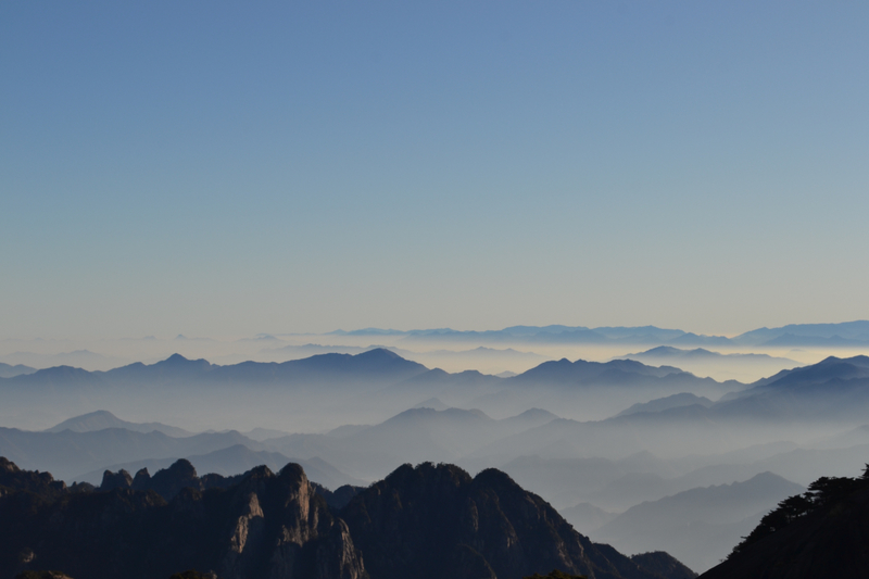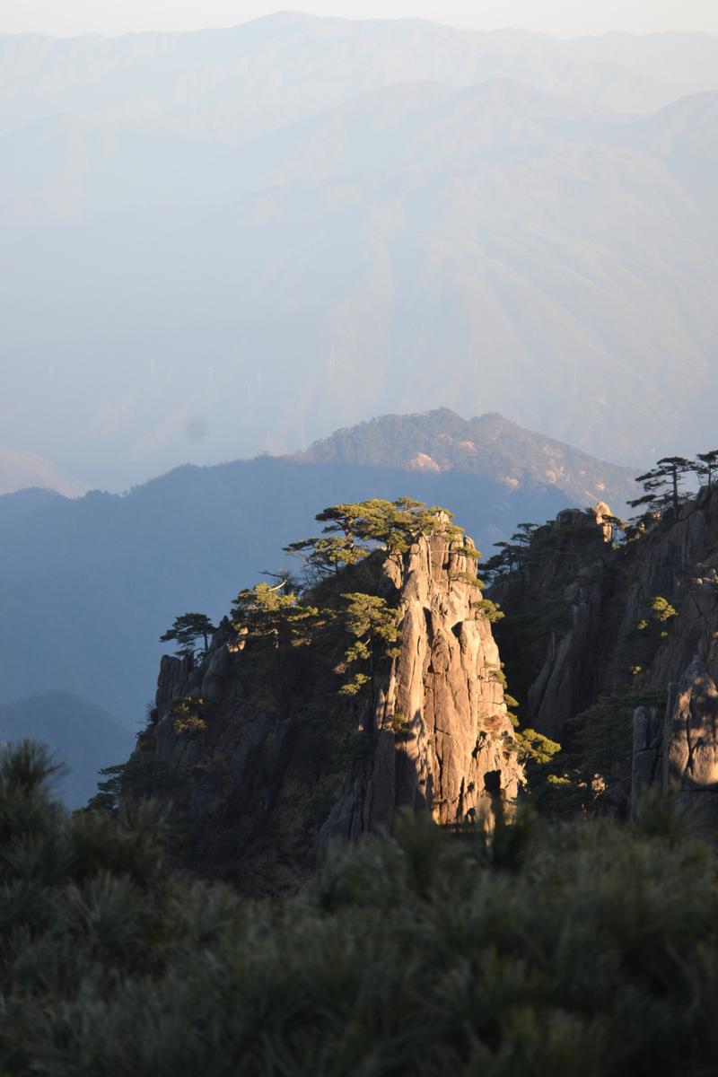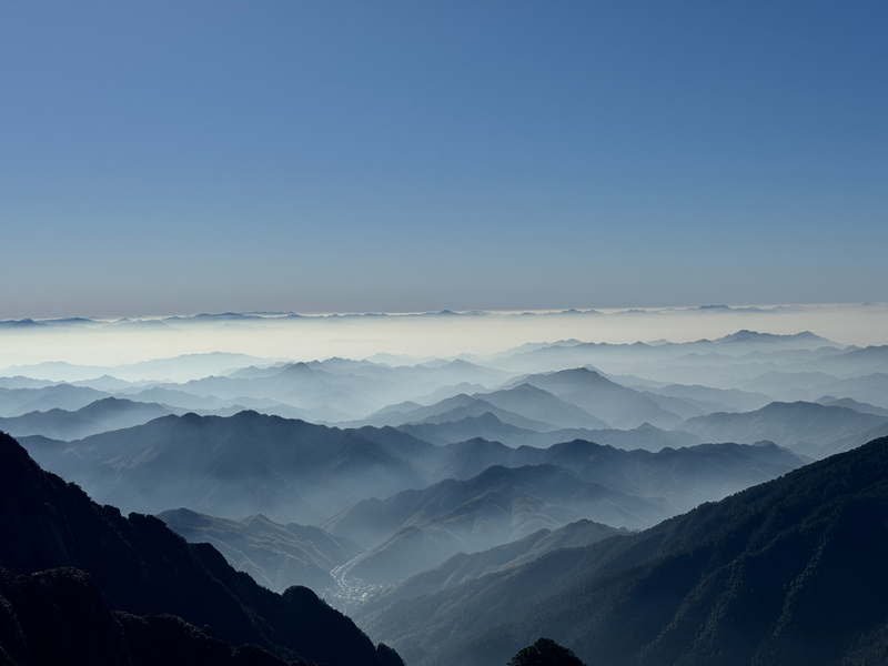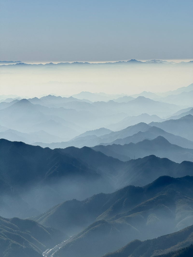 看完日出,简单吃了早饭收拾好,我再次出发前往光明顶。此时的光明顶与昨晚相比,又是另一番景象。阳光明媚,视野更加清晰,远处的山峰连绵起伏,仿佛一幅巨大的山水画卷。从光明顶下来,我们途经白云宾馆,来到鳌鱼峰观景台。远看鳌鱼峰的雄伟,以及远处的美景。走过鳌鱼峰,便是垂直坡度较大的下山路,由于周末上山的人很多,更加导致了下山要谨慎。走过后回头看,更是陡峭。来到百步天梯更是人多到及其拥堵,我们小心翼翼地沿着台阶向上走。但在攀登的过程中,也能欣赏到独特的风景。两侧的山峰陡峭如壁,岩石纹理清晰可见,让人不得不佩服大自然的神奇力量。期间远处眺望,看到水墨黄山奇景,层次交叠,又通透。