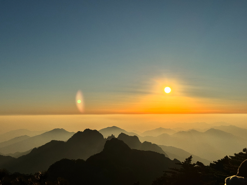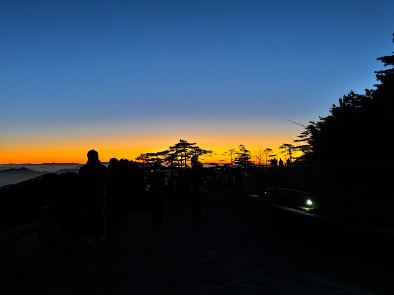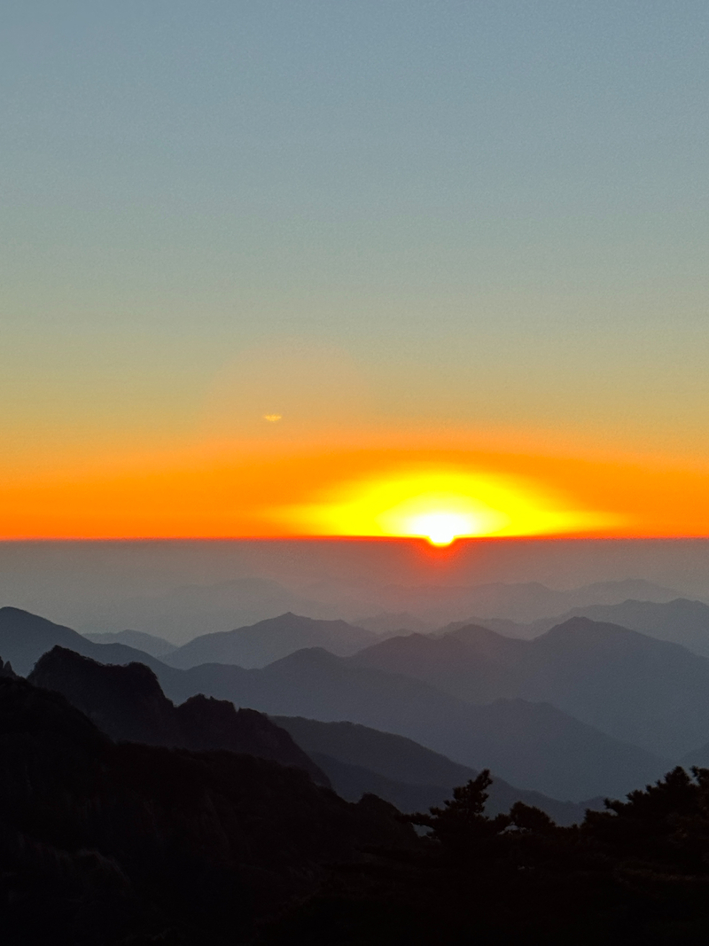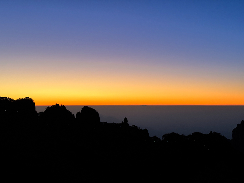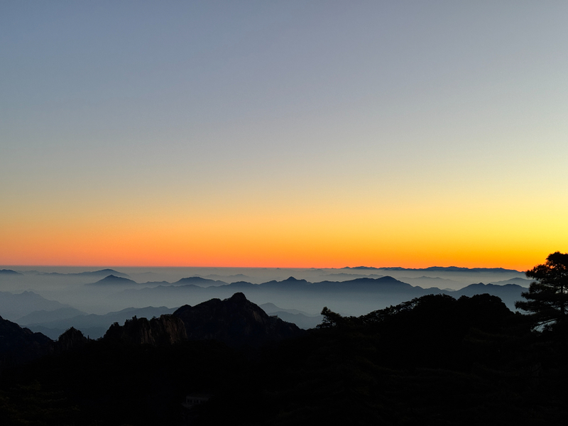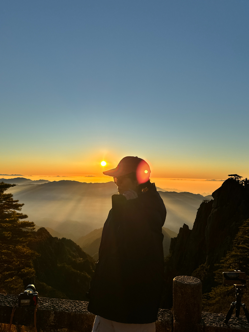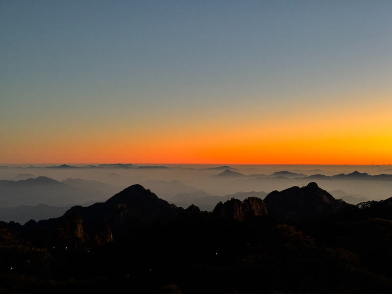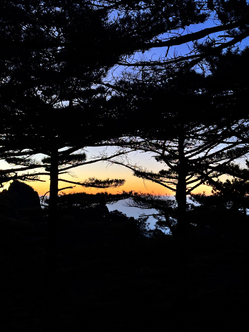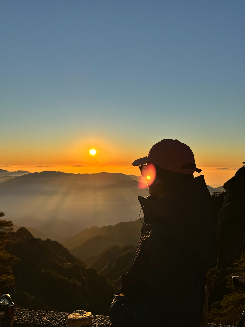 赶在日落前,我们来到光明顶。光明顶是黄山的第二高峰,海拔 1860 米。站在山顶,整个黄山尽收眼底。夕阳的余晖洒在山峰上,给山峦披上了一层金色的外衣。天边的晚霞绚丽多彩,与云海相互映衬,构成了一幅绝美的画卷。在人群挤满的山顶,欣赏着这壮丽的日落景象,心中充满了对大自然的敬畏和赞美之情。