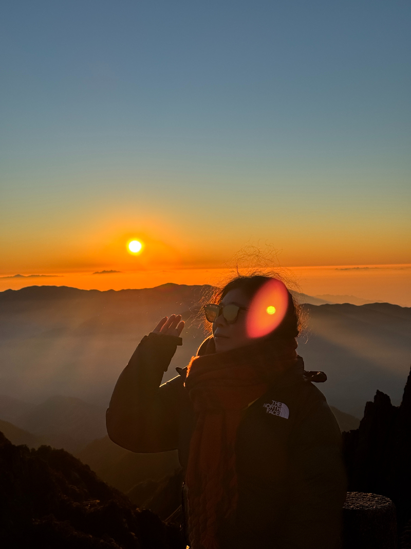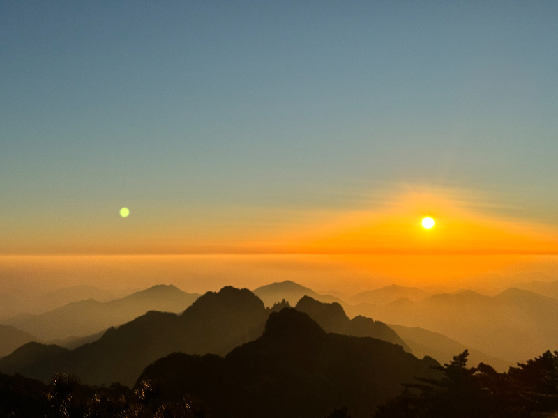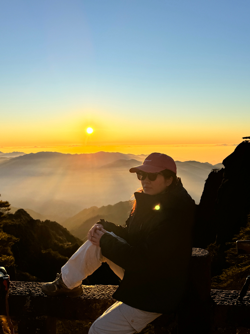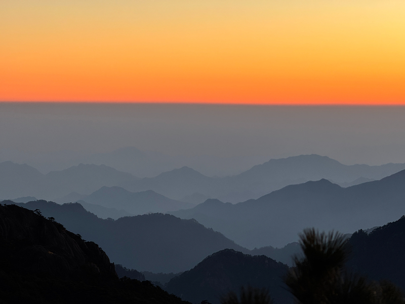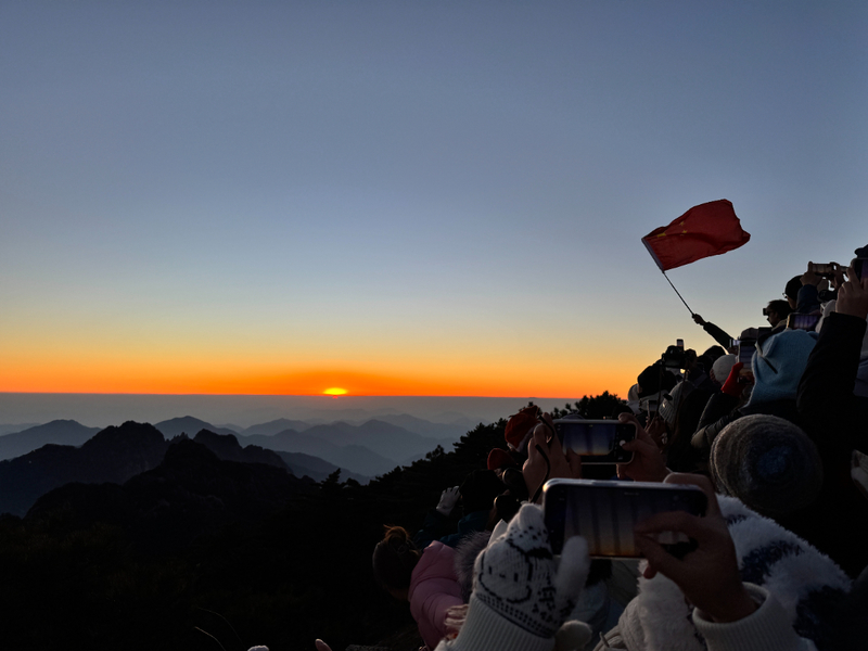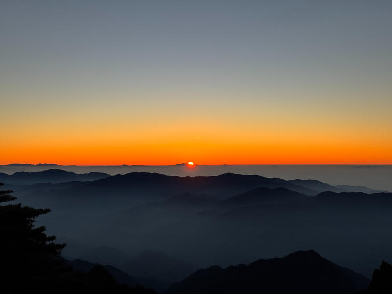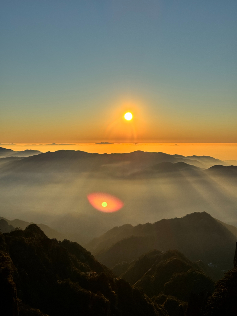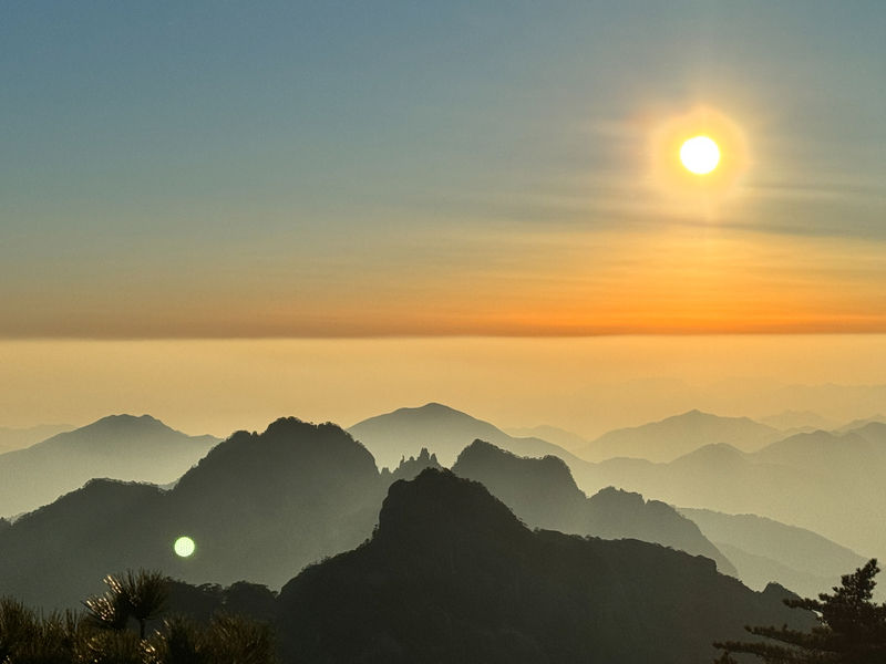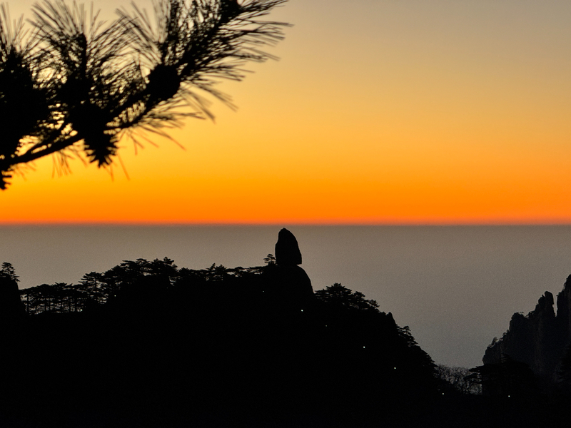 赶在日落前,我们来到光明顶。光明顶是黄山的第二高峰,海拔 1860 米。站在山顶,整个黄山尽收眼底。夕阳的余晖洒在山峰上,给山峦披上了一层金色的外衣。天边的晚霞绚丽多彩,与云海相互映衬,构成了一幅绝美的画卷。在人群挤满的山顶,欣赏着这壮丽的日落景象,心中充满了对大自然的敬畏和赞美之情。