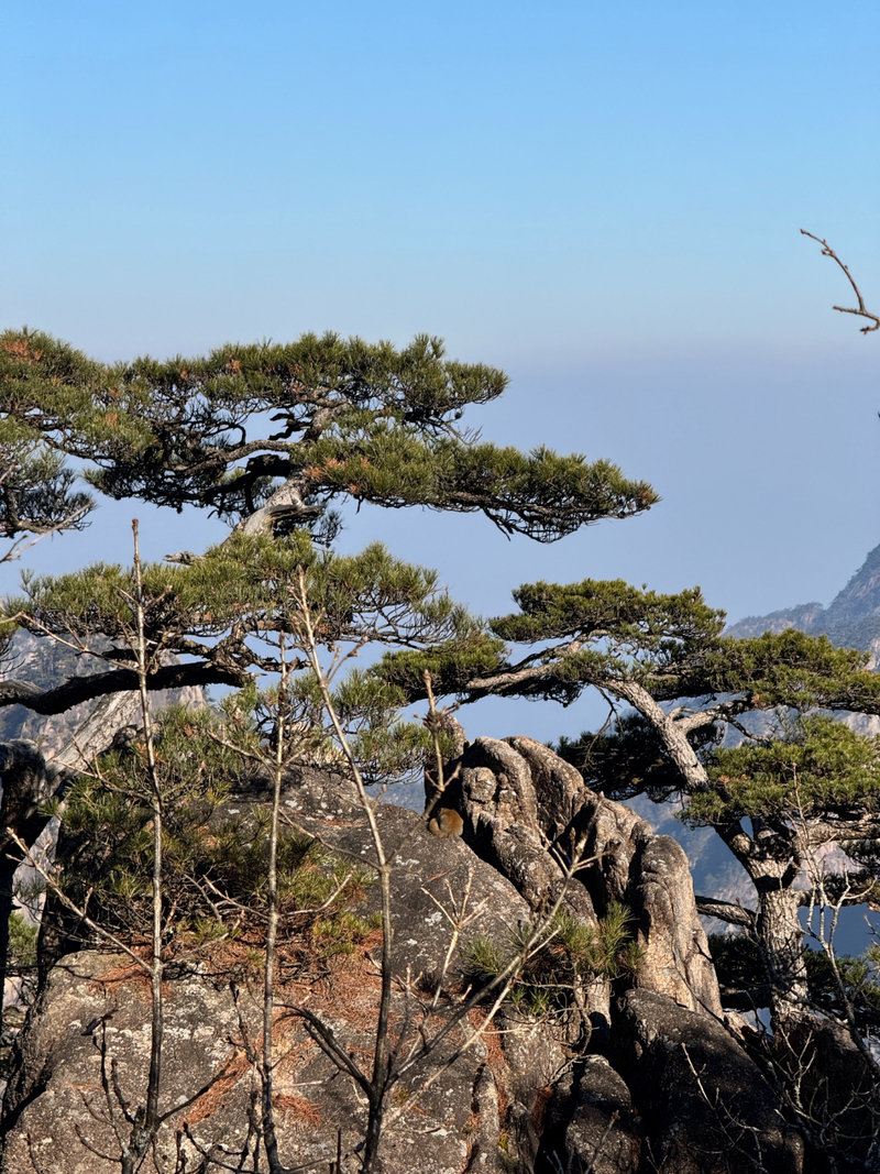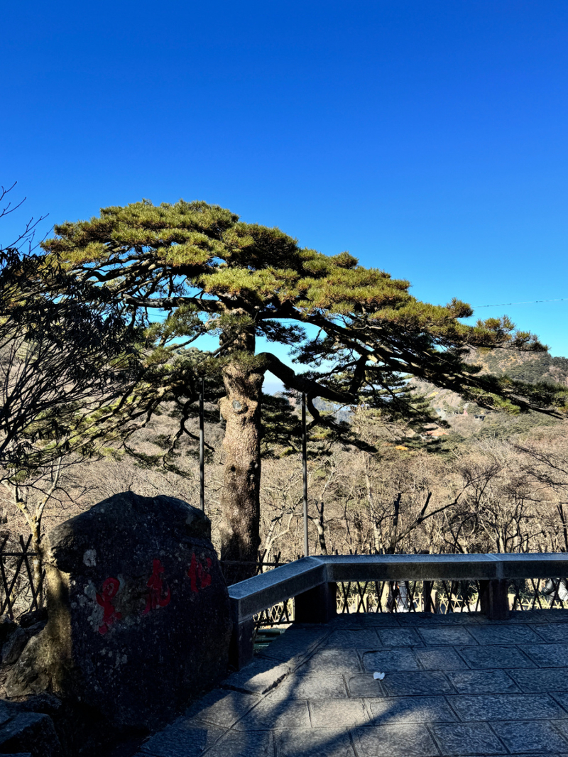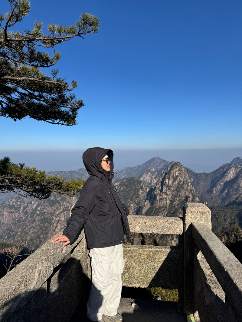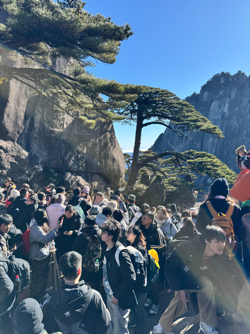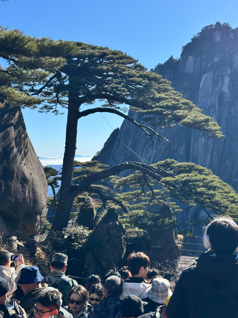 最后,来到了黄山的标志性景点 —— 迎客松。迎客松屹立在悬崖边,枝干向一侧伸展,仿佛在向游客们热情地招手。这棵历经千年风雨的松树,依然生机勃勃,展现出顽强的生命力。我们在迎客松前停留了一会,想尽各种办法拍一张迎客松,将这美好的瞬间定格下来。