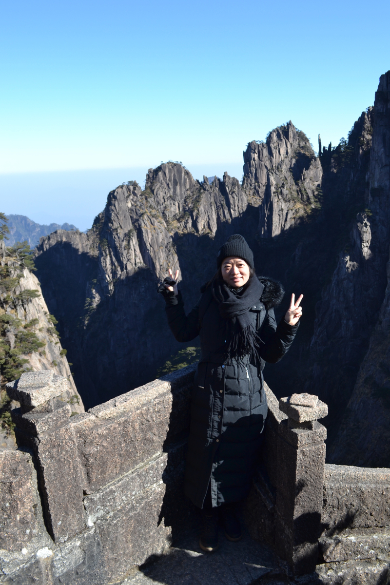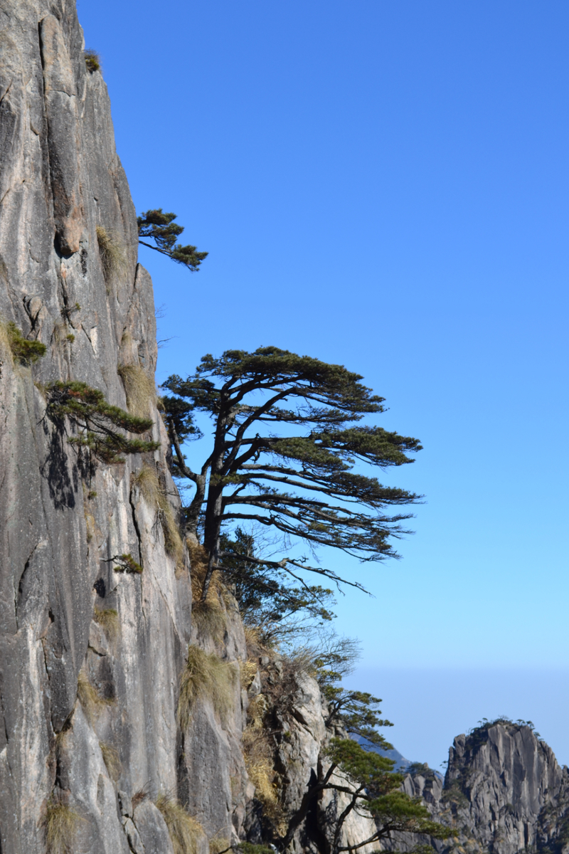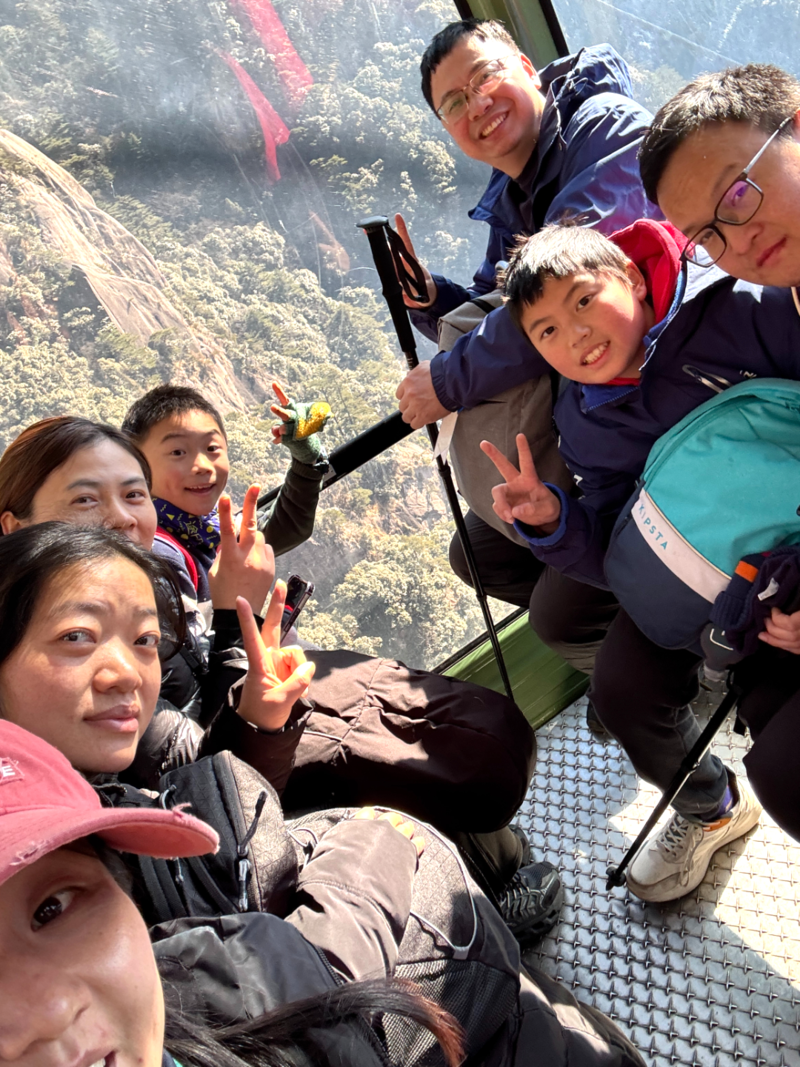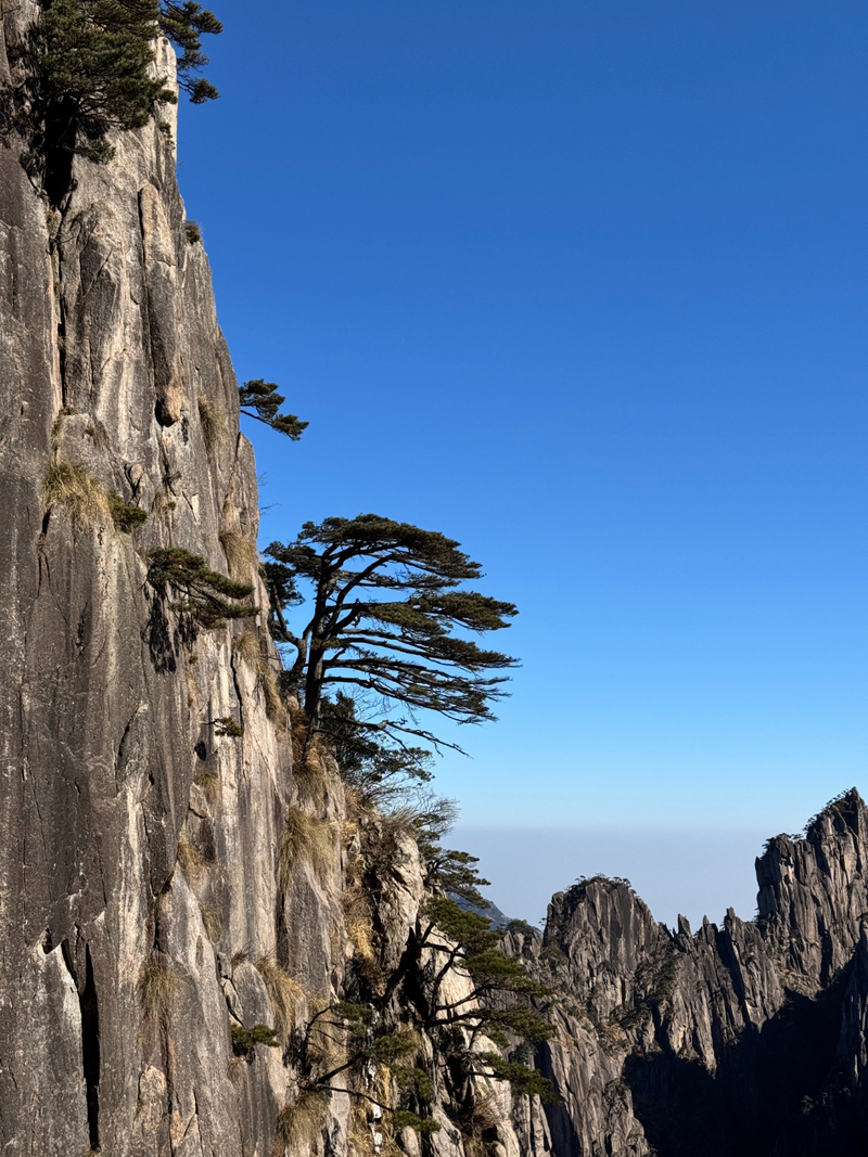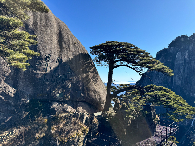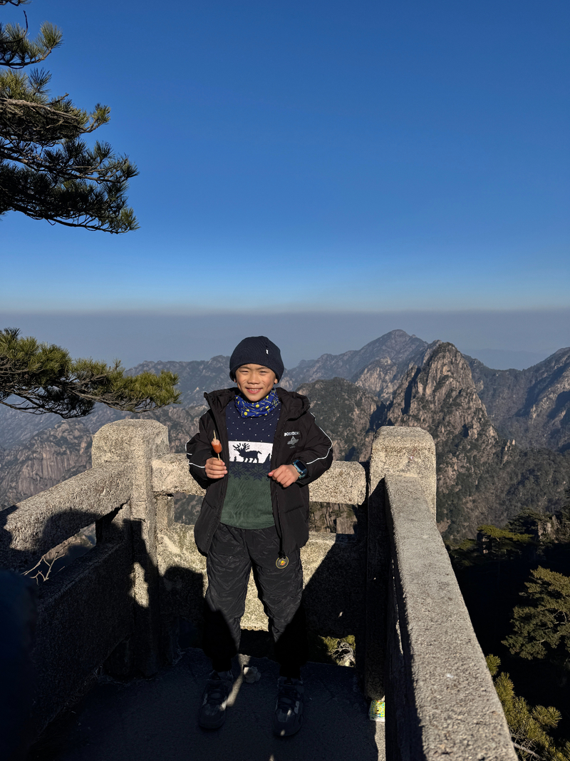 最后,来到了黄山的标志性景点 —— 迎客松。迎客松屹立在悬崖边,枝干向一侧伸展,仿佛在向游客们热情地招手。这棵历经千年风雨的松树,依然生机勃勃,展现出顽强的生命力。我们在迎客松前停留了一会,想尽各种办法拍一张迎客松,将这美好的瞬间定格下来。