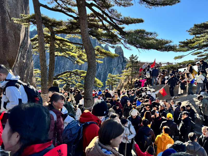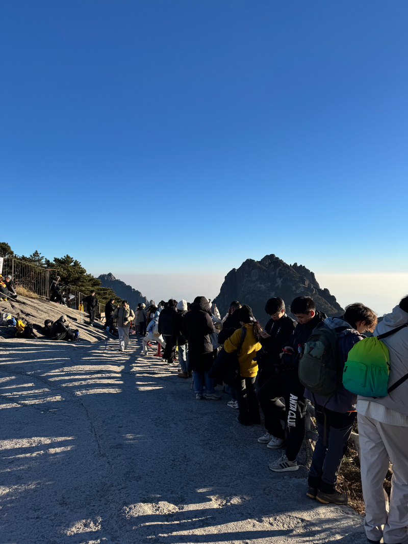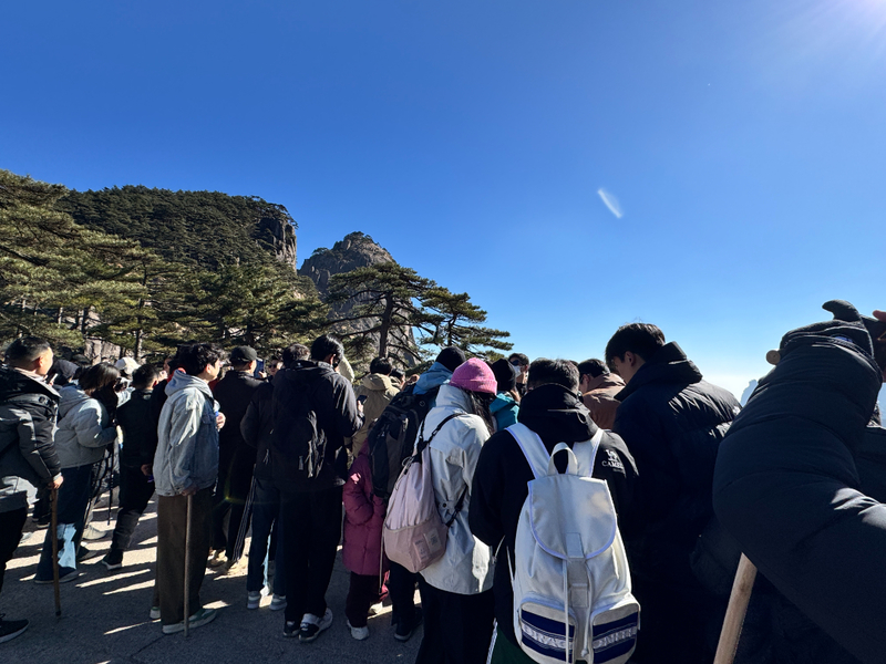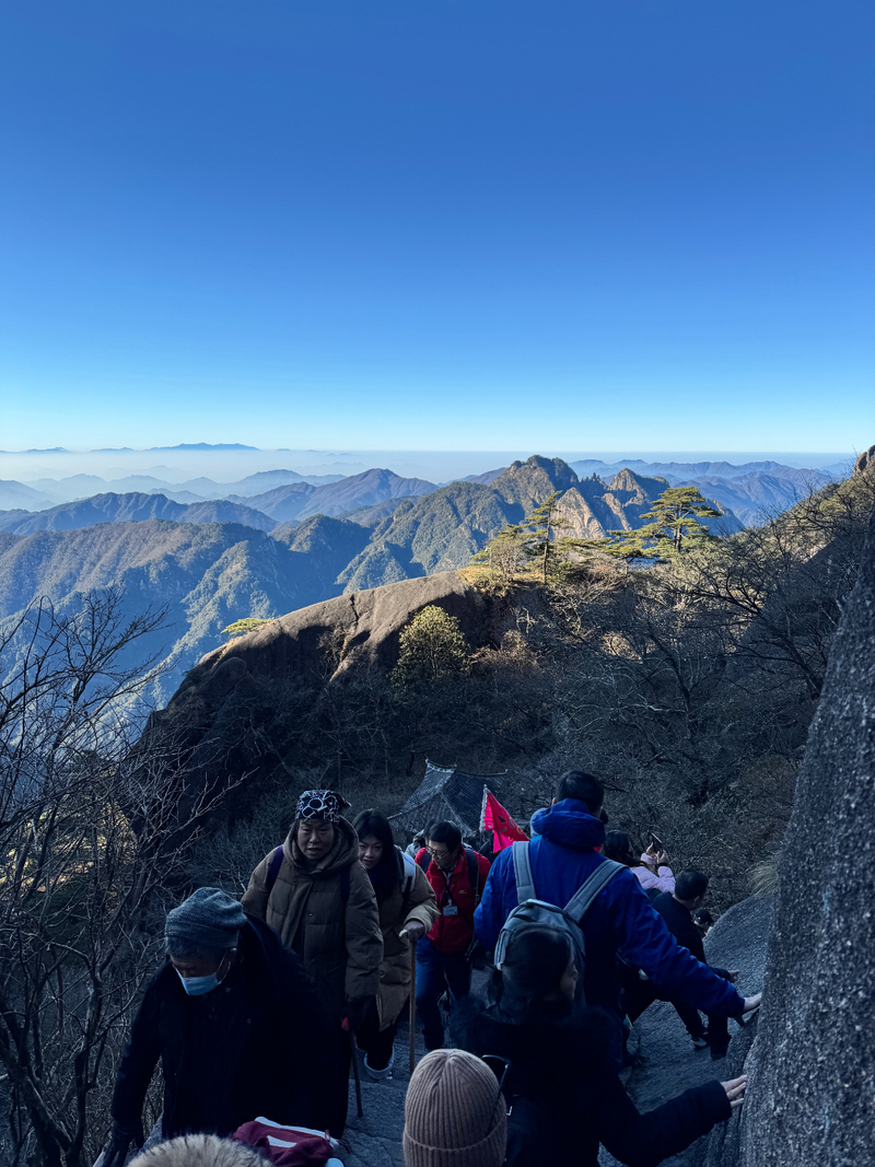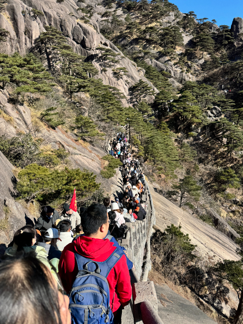 周六早上八点半左右开始进山,在坐短驳车之前,已经有工作人员开始给人群分流。我们是后山上前山下,晚上住在白鹅山庄。上山的方式有两种,可以选择徒步上去,大概两个半小时,或者是索道上去。到达山顶的游玩顺序,先去始信峰,沿着蜿蜒的山路攀登,沿途的松树形态各异,像是在向游客展示着黄山的独特魅力。登上始信峰,极目远眺,云海在山峰间翻腾涌动,如梦如幻,让人不禁感叹大自然的鬼斧神工。离开始信峰,便来到了黑虎松。这棵古老的松树高大挺拔,树干粗壮,针叶茂密,仿佛一只威风凛凛的黑虎盘踞在此。继续前行,来到白鹅岭。这里视野开阔,是观赏黄山群峰的绝佳地点。远处的山峰在云雾中若隐若现,有的像利剑直插云霄,有的像仙女亭亭玉立,千姿百态,美不胜收。