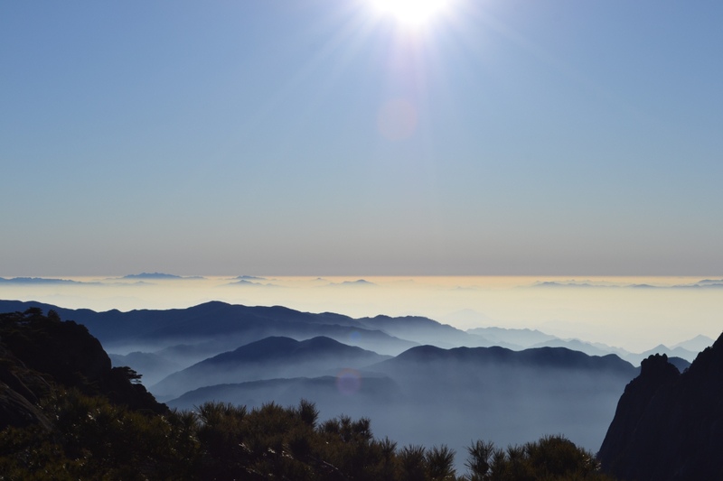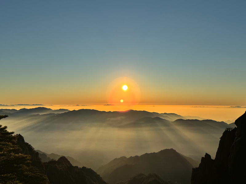 第二天,天还未亮,我们便早早地起床,来到白鹅山庄前等待日出。此时,山顶上已经聚集了许多游客,大家都怀着激动的心情,翘首以盼。渐渐地,天边泛起了一丝红晕,太阳慢慢从云层中探出了头。万道金光洒向大地,整个黄山被染成了金黄色。山峦、云海、松树在阳光的照耀下,显得更加生机勃勃。