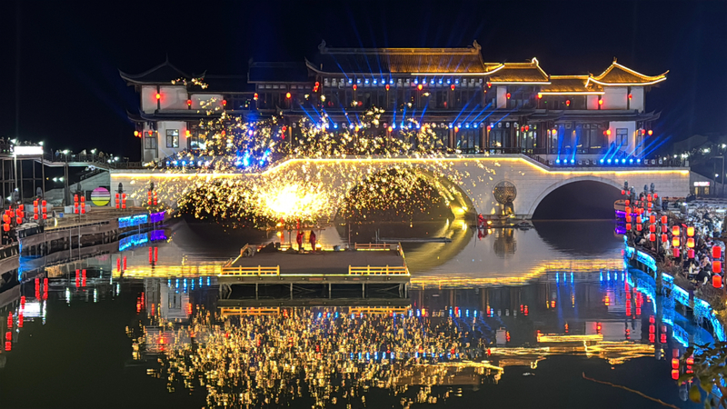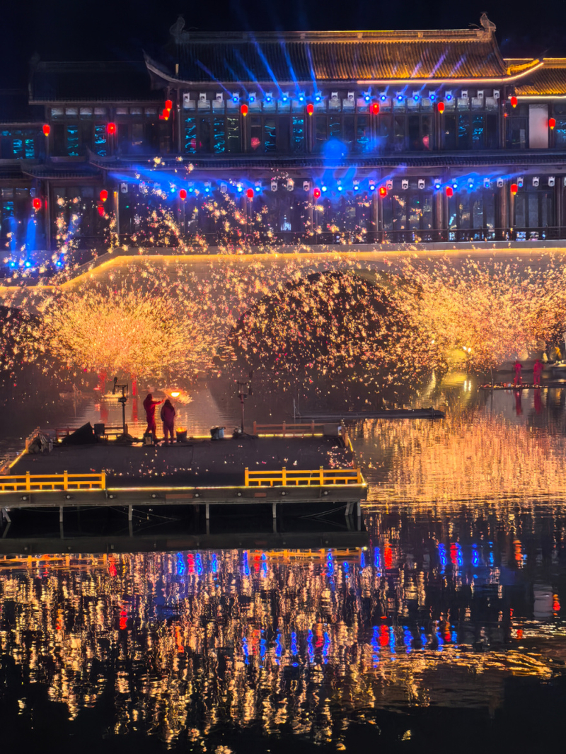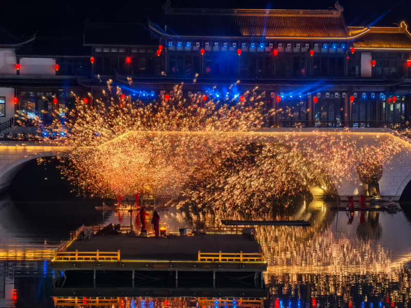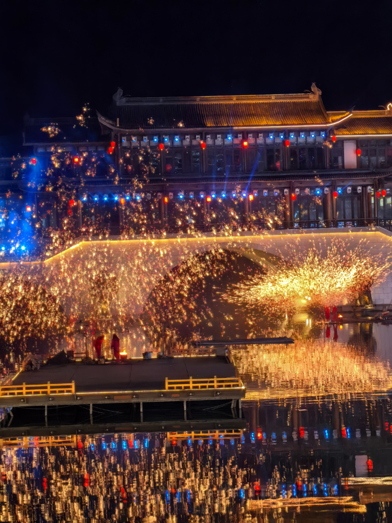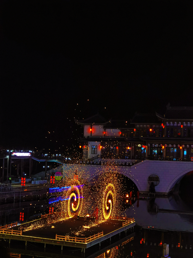 太湖古镇的打铁花表演是一场不容错过的视觉盛宴,每日有两场表演,分别是18点和20点,持续12分钟。表演是在鲤鱼门九鼎桥舞台,最佳观看点是在同心桥。