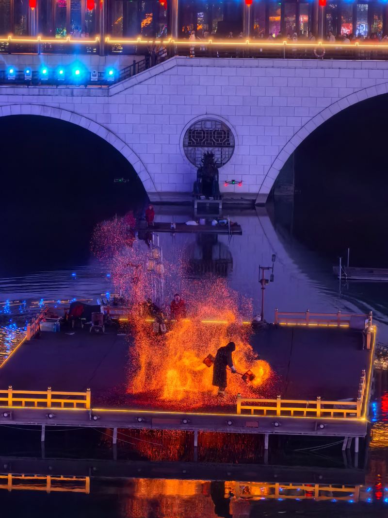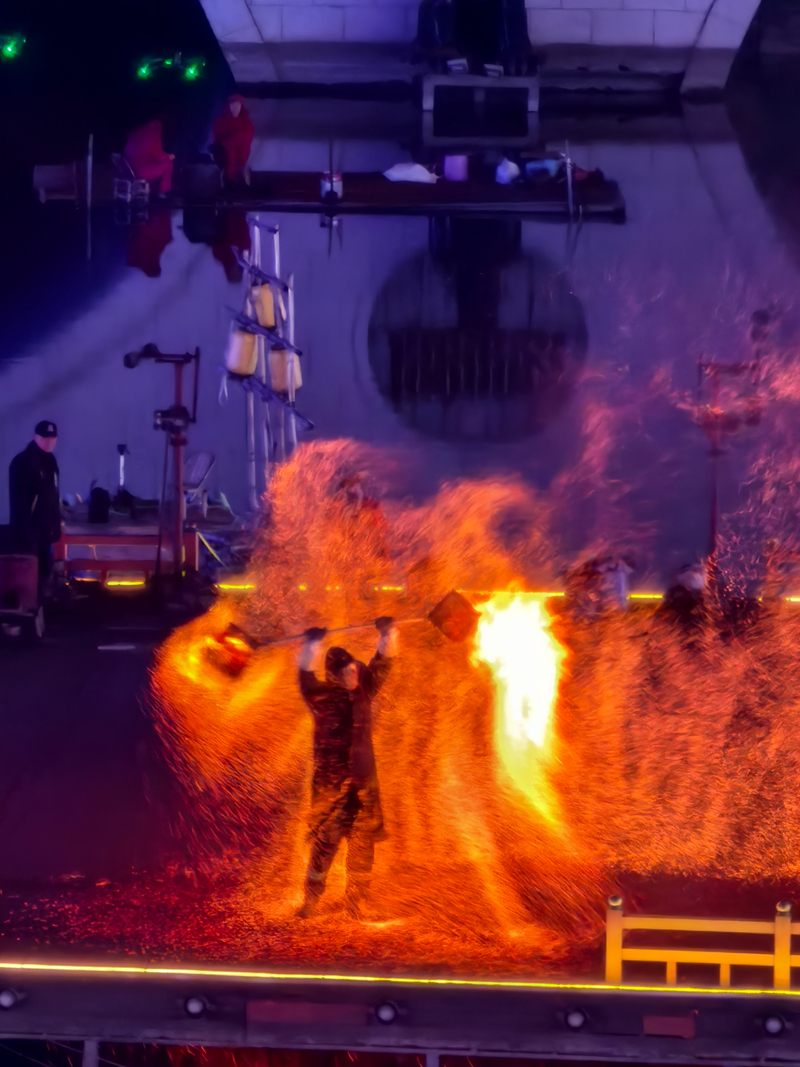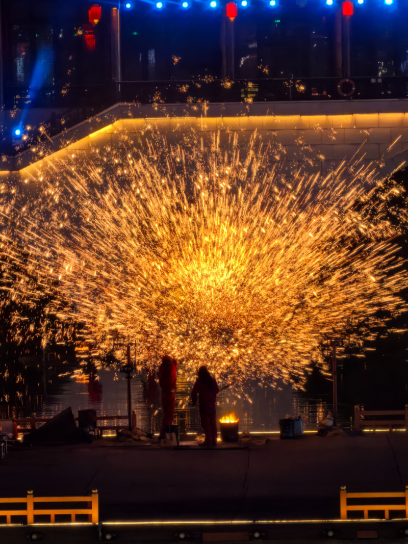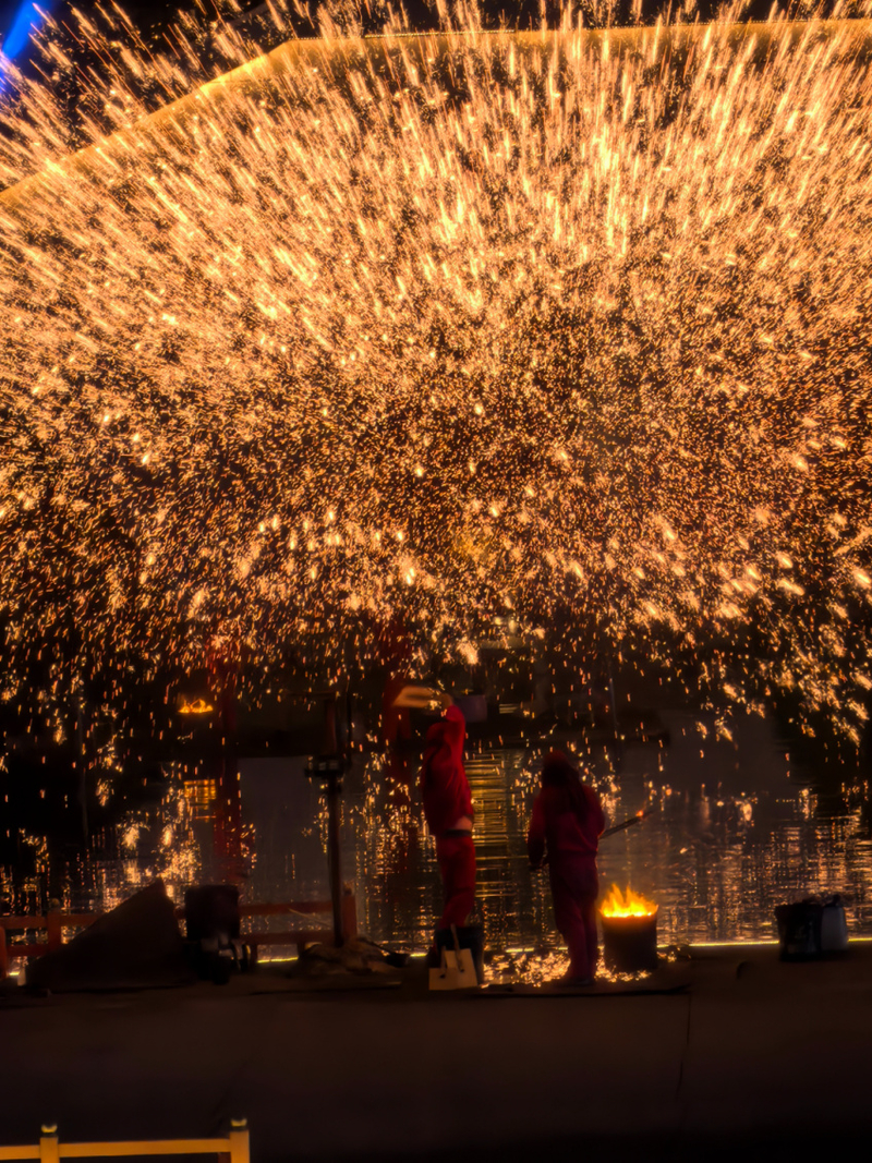 打铁花起源于北宋,鼎盛于明清时期,至今已有一千多年历史,是极具特色的非遗表演。技艺娴熟的铁花工匠,光着膀子围着 1600℃高温火炉,将铁水泼洒向空中,铁水瞬间化作璀璨的火花,似烟花般绚烂,又如繁星坠入镜中,形成火树银花不夜天的壮观景象。