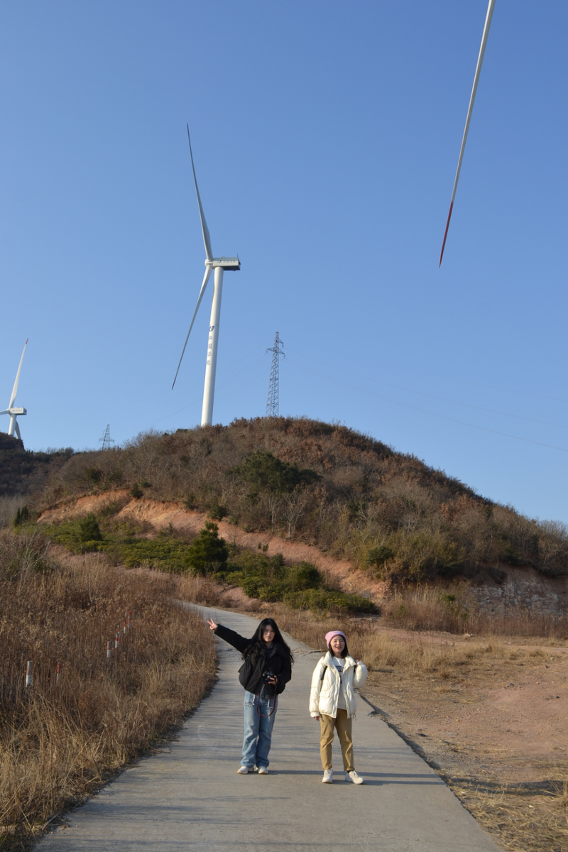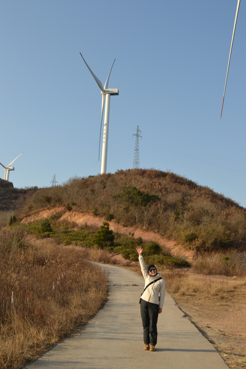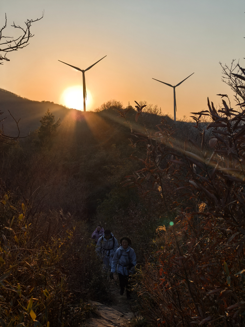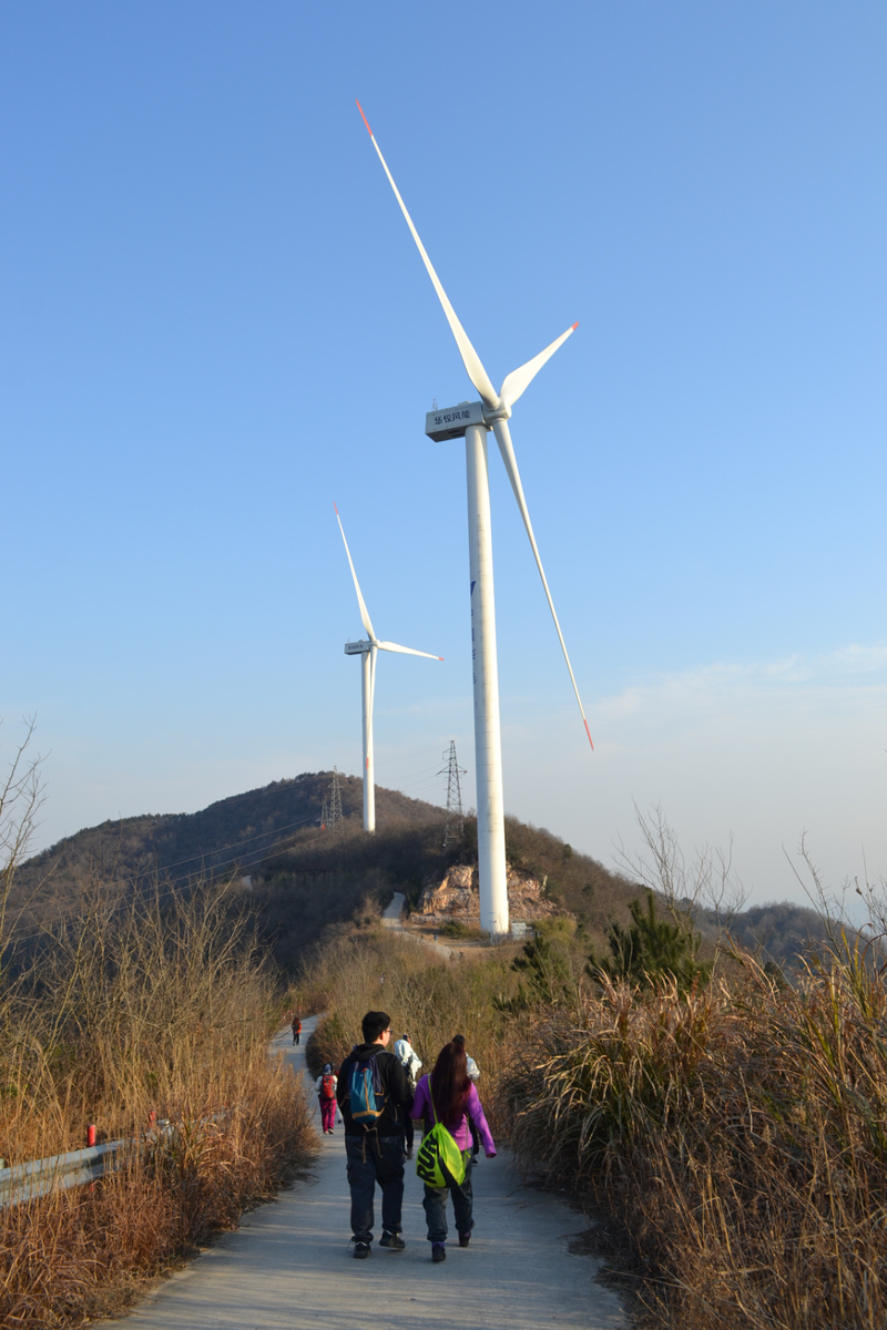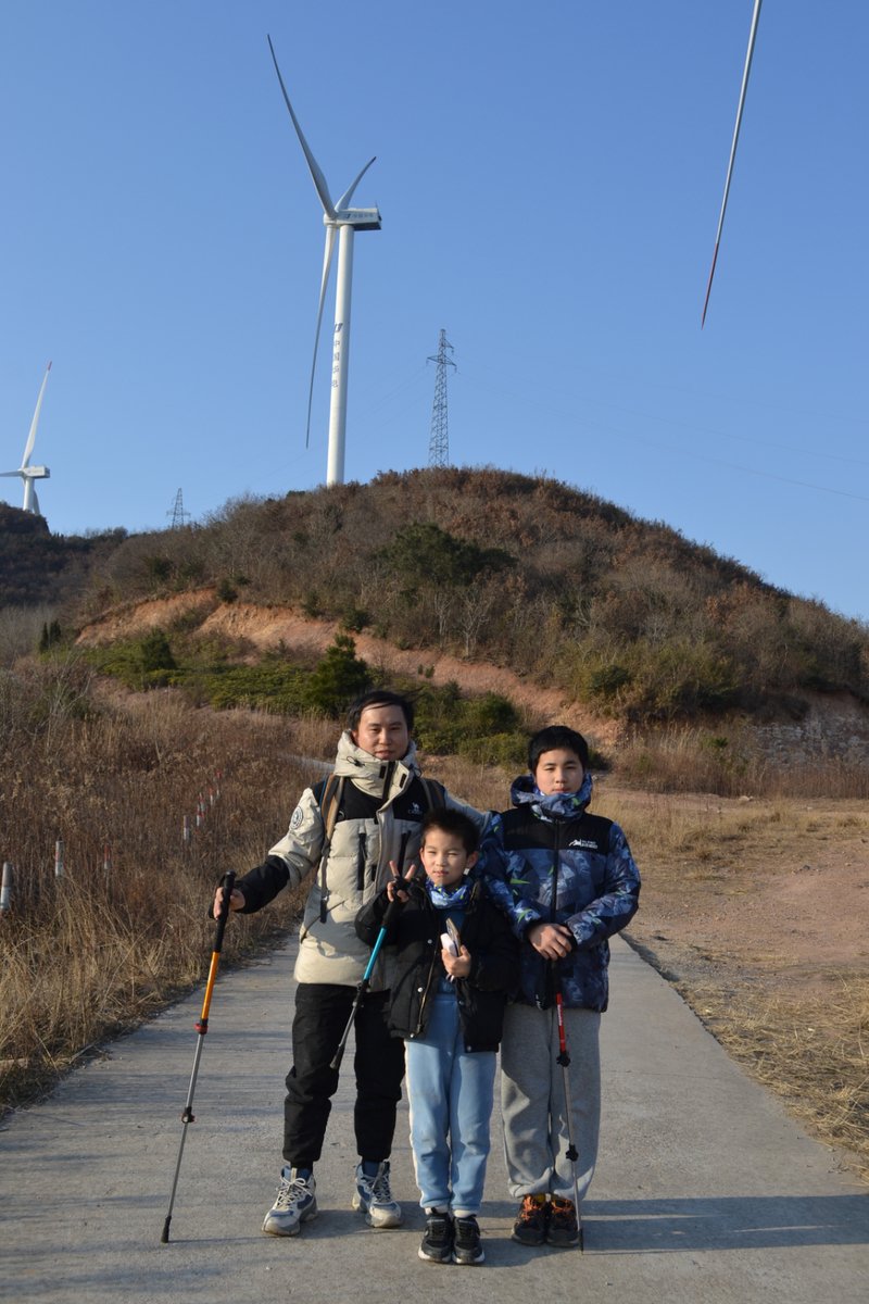 徒步约1.5小时可以达到山顶,在山顶可以看最美风车,穿越山脊,然后下山,下山路有些短距离坡度大的下山,沿途有绳子可以拉着,同步走山脊线,瞭望太湖全景,看山顶风车旋转。