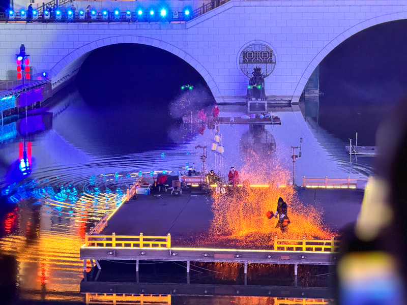 火壶表演是在每天的19点有一场,持续大概5分钟。火壶表演也是一项极具特色的非遗表演。火壶表演是表演者把烧好的木炭放入两边的铁网,通过上下抖动铁网,使炭火产生火花,火花四溅,形成 “火树银花” 般的美丽场景,同时该表演还有 “百家安宁” 的美好祝福。