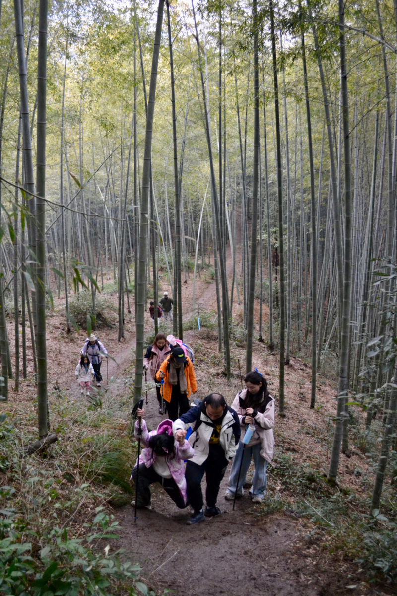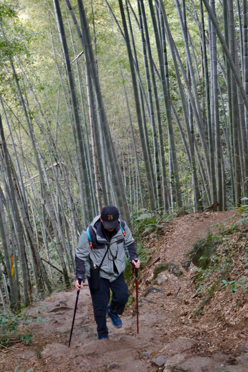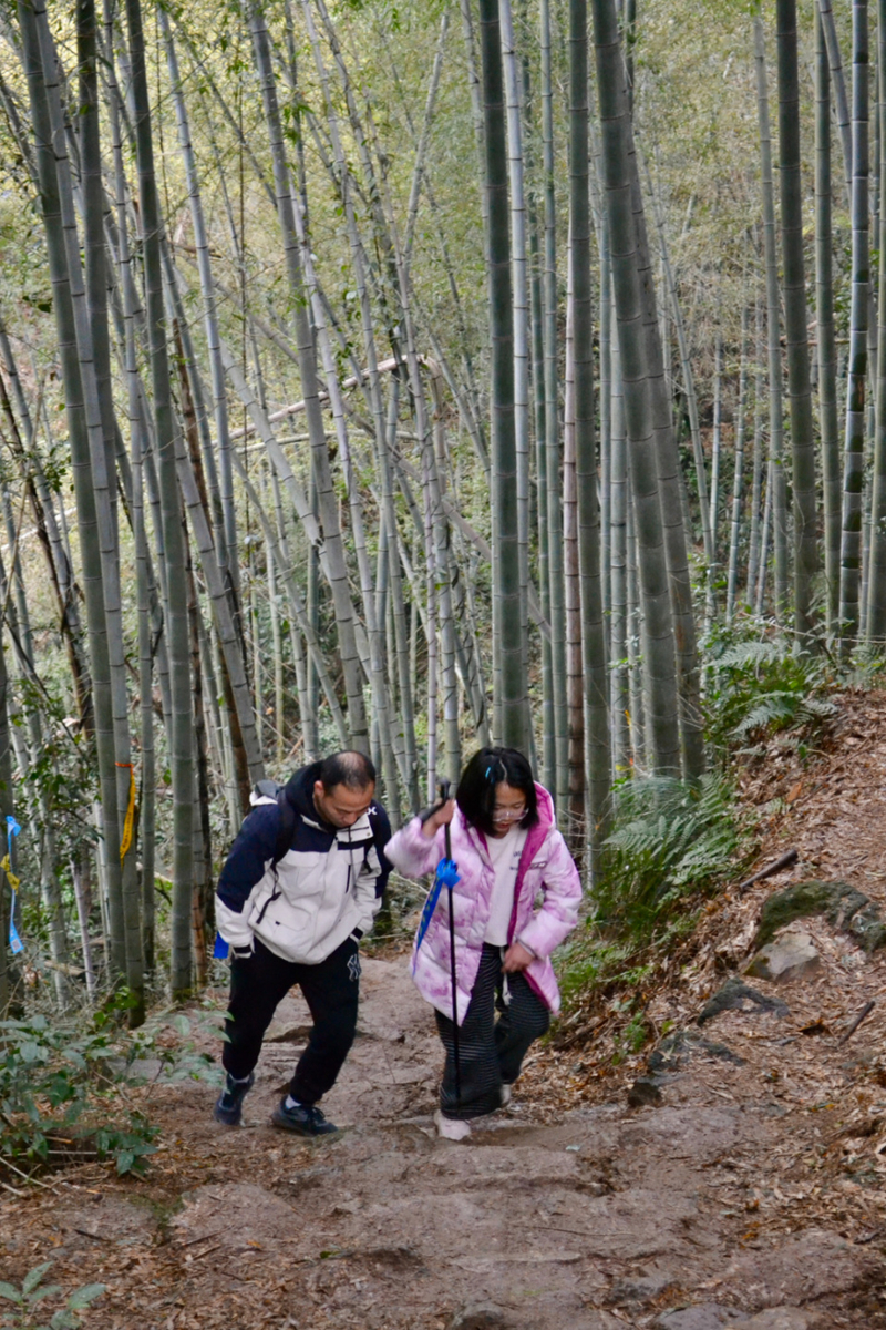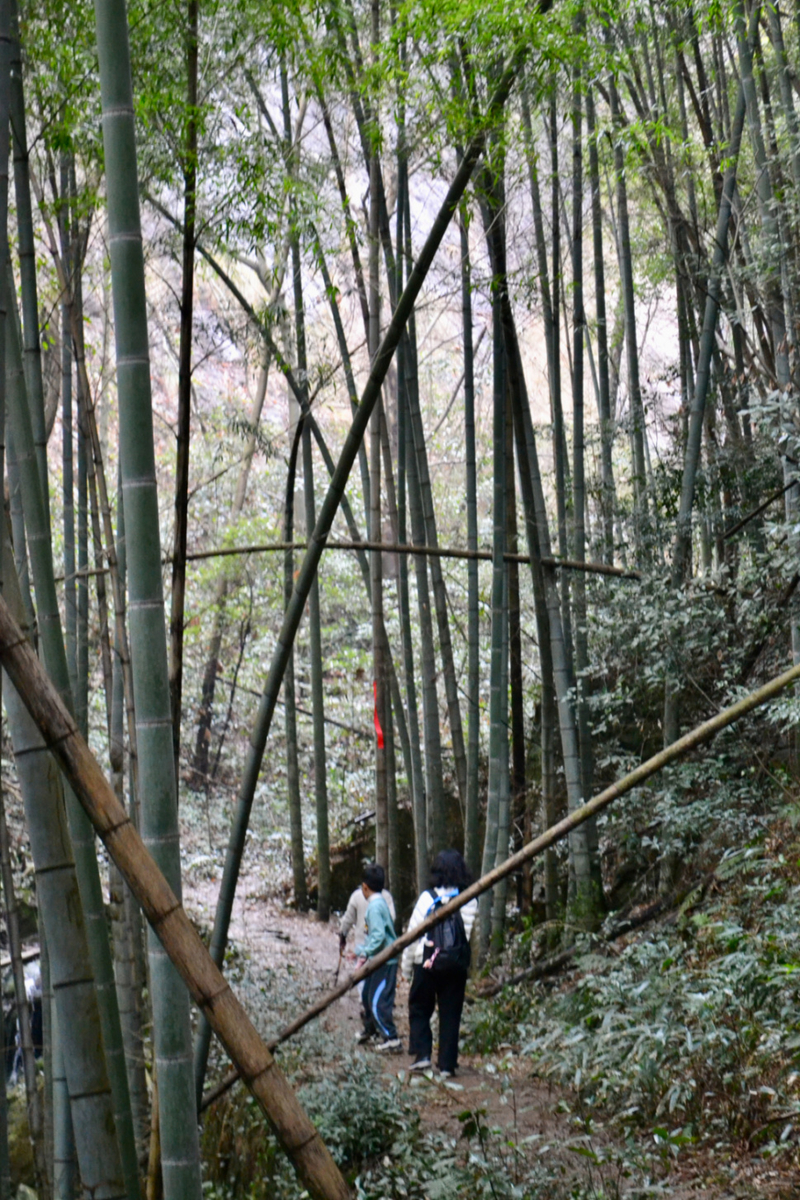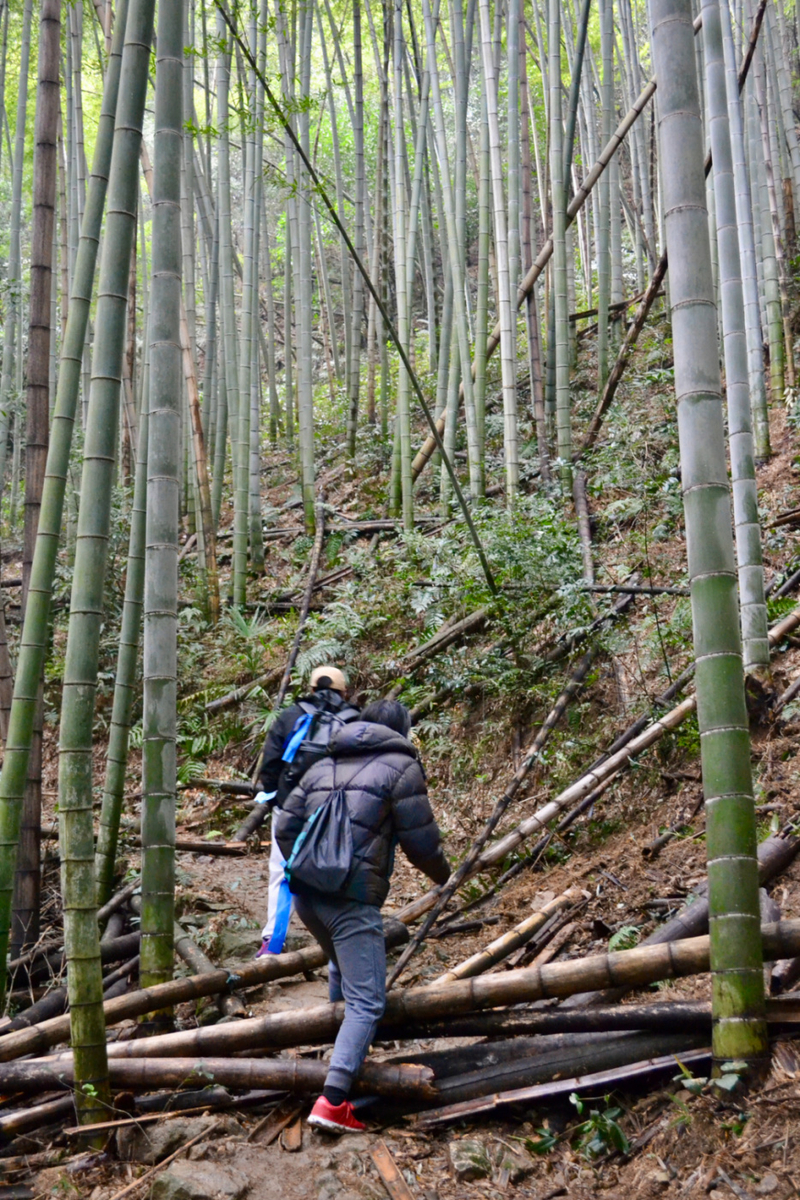 途中,有一段路下山较为陡峭,再加上泥泞的路面让行走变得更加艰难。我们小心翼翼地用登山杖支撑好,一步一步地向下挪动。经过最后一段竹林泥巴路,我们来到曹山古寺,大家在这里调整休息一下。