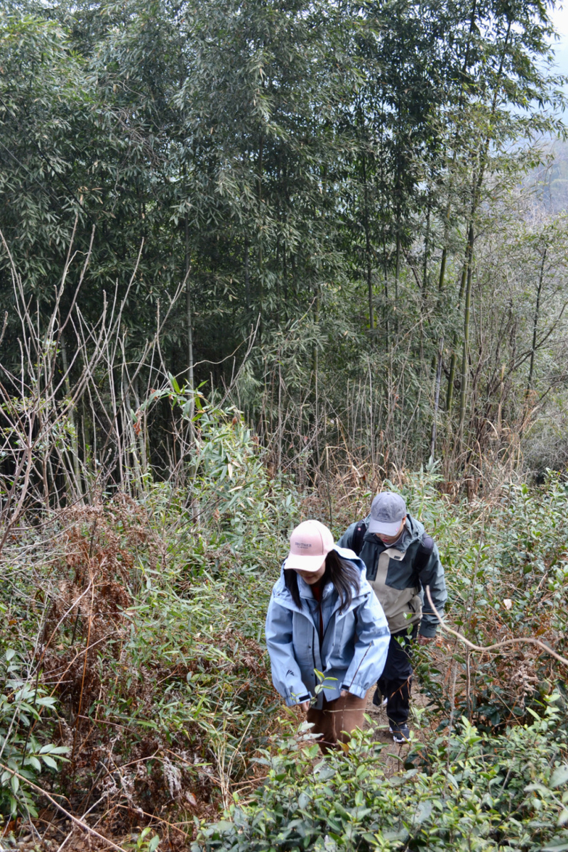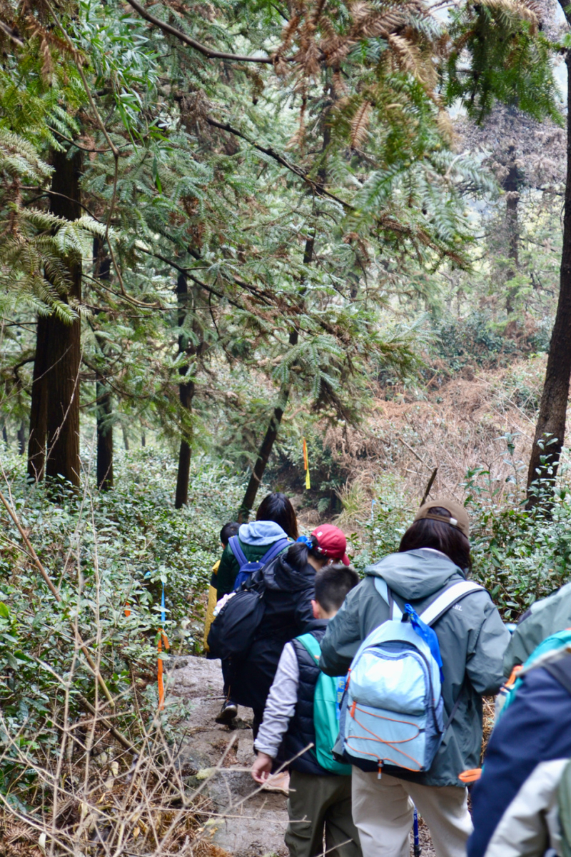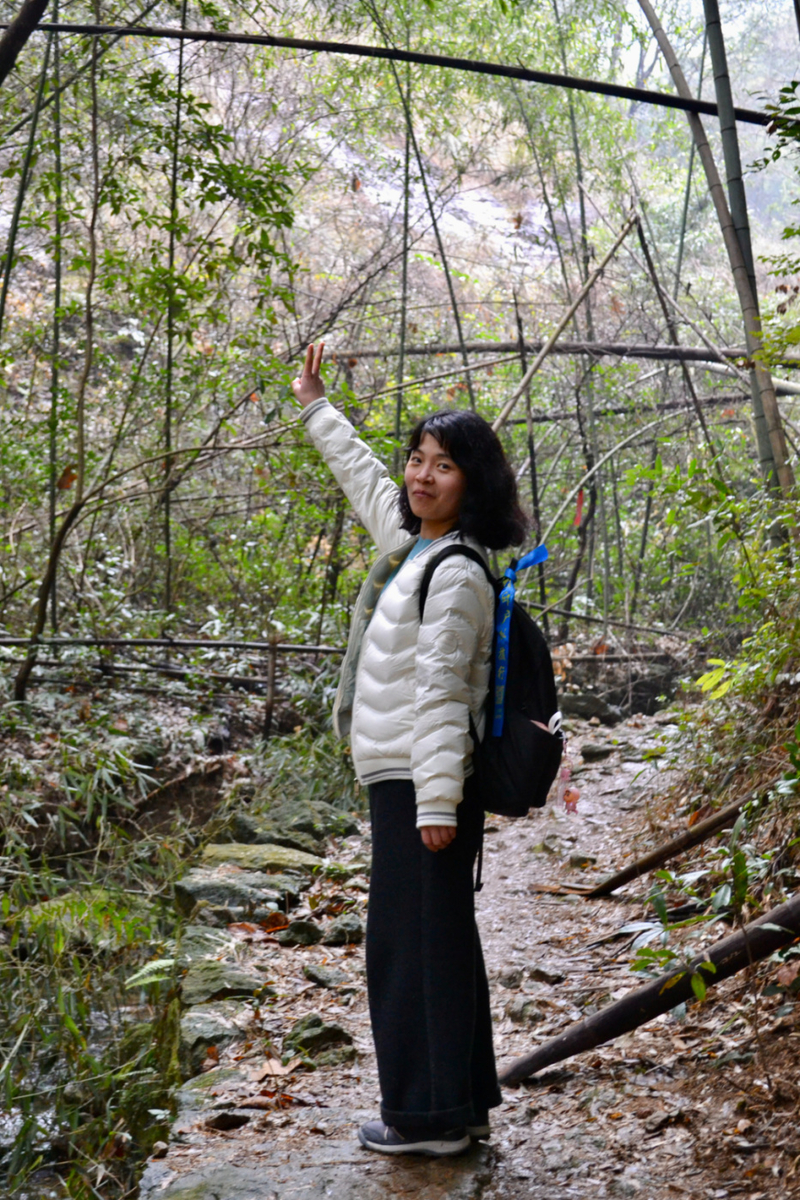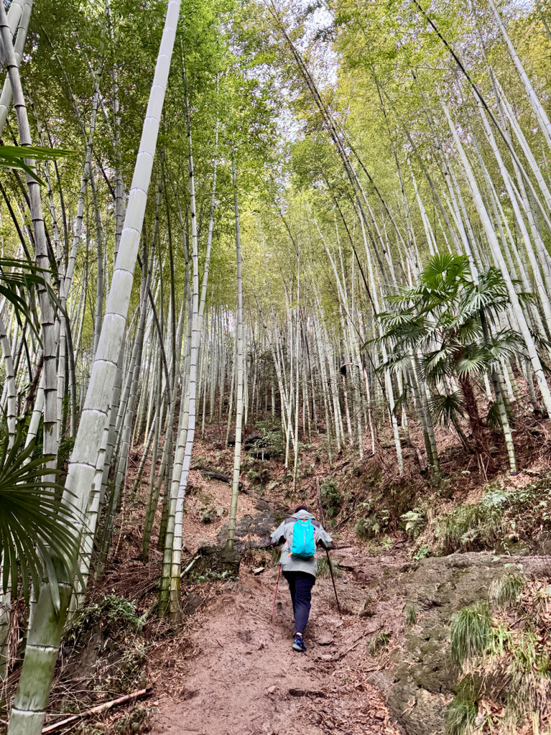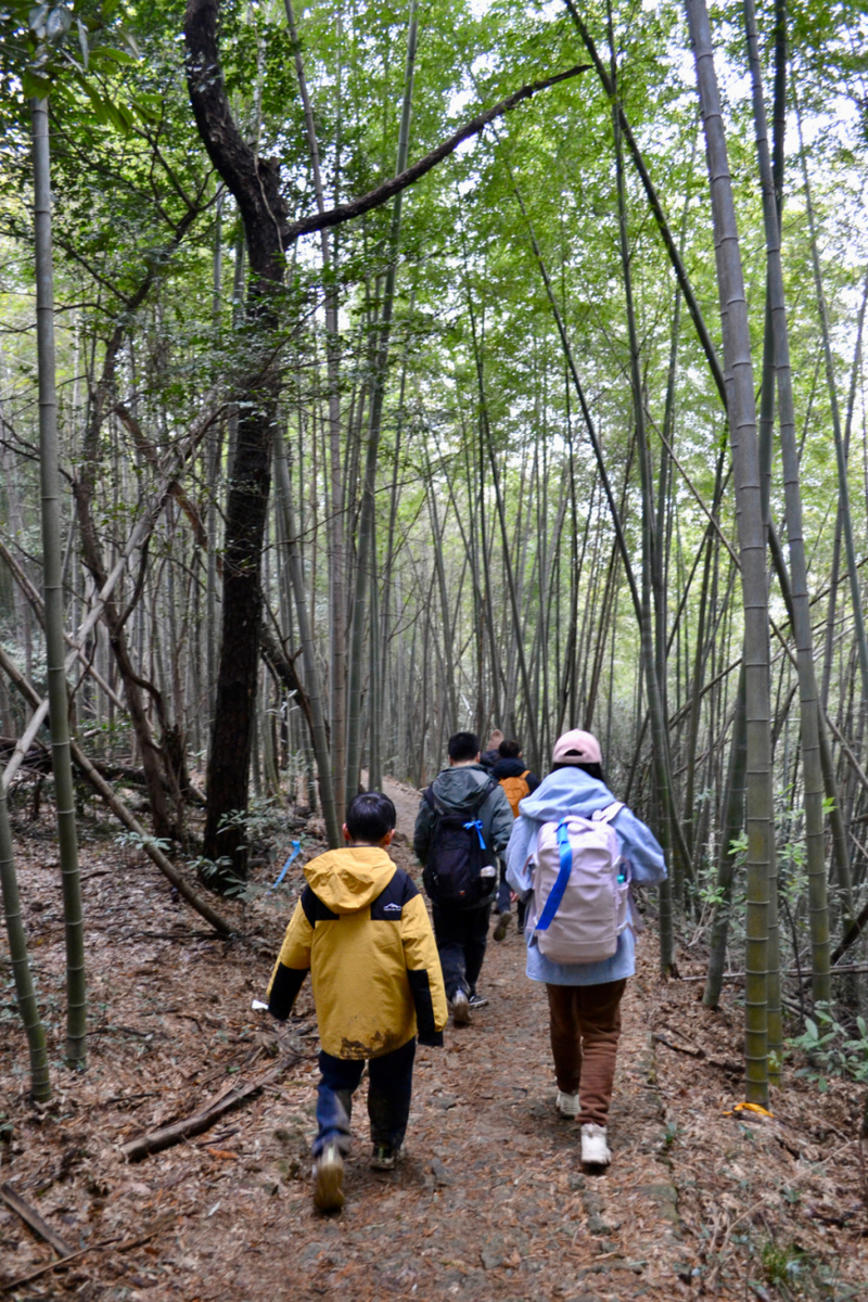 途中,有一段路下山较为陡峭,再加上泥泞的路面让行走变得更加艰难。我们小心翼翼地用登山杖支撑好,一步一步地向下挪动。经过最后一段竹林泥巴路,我们来到曹山古寺,大家在这里调整休息一下。