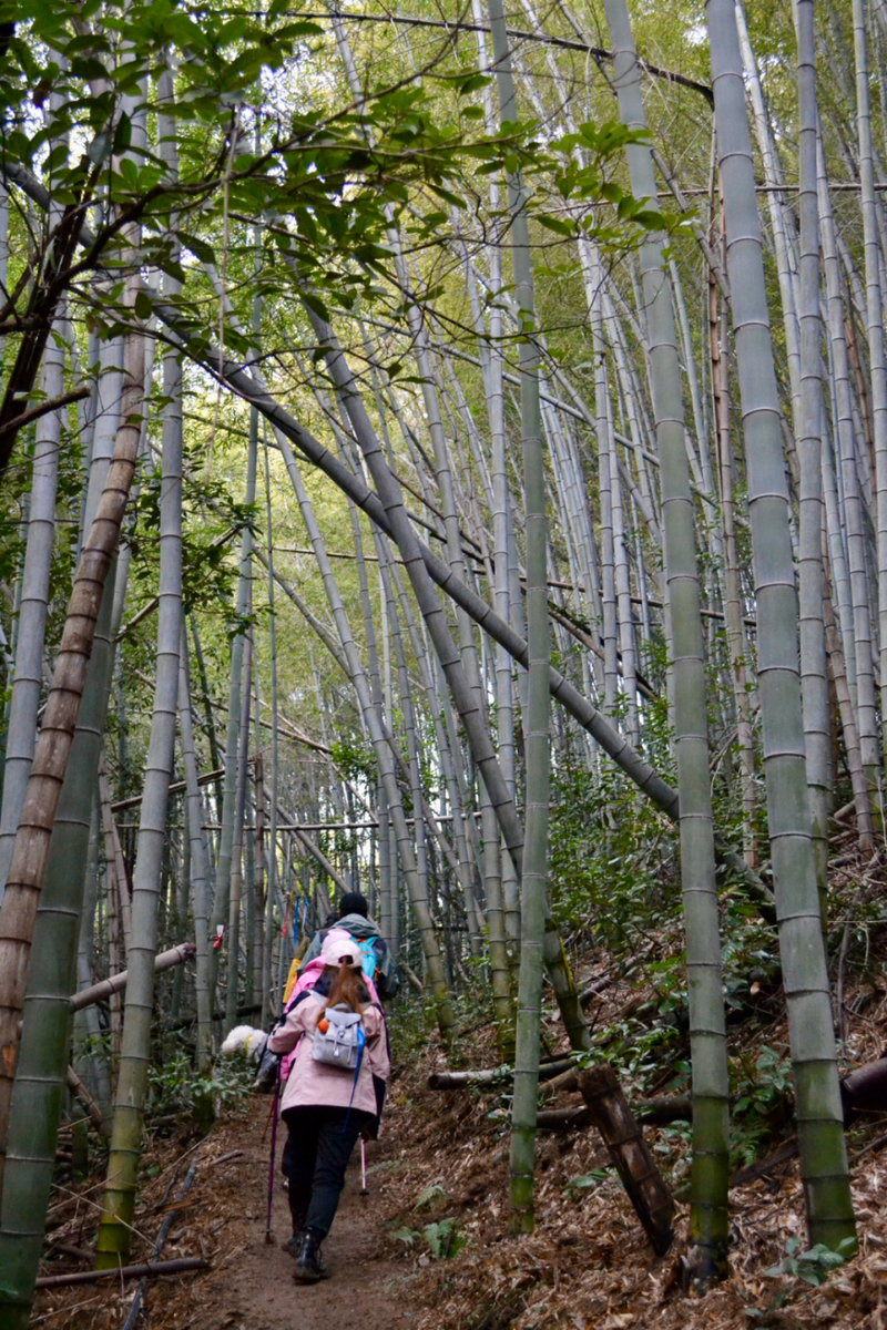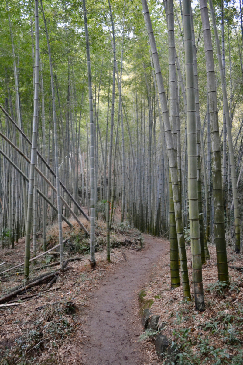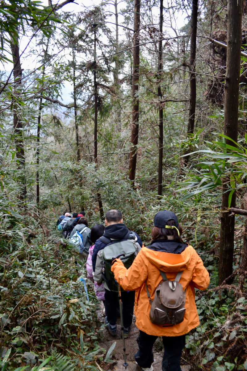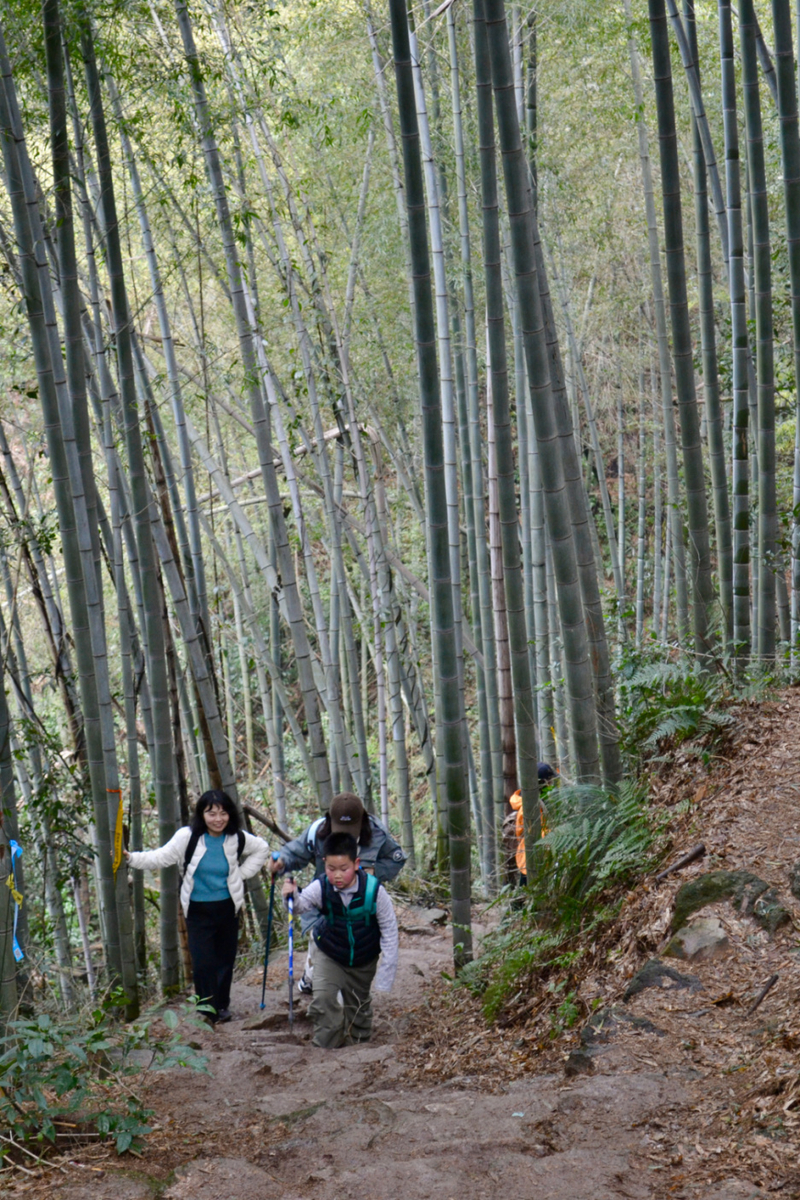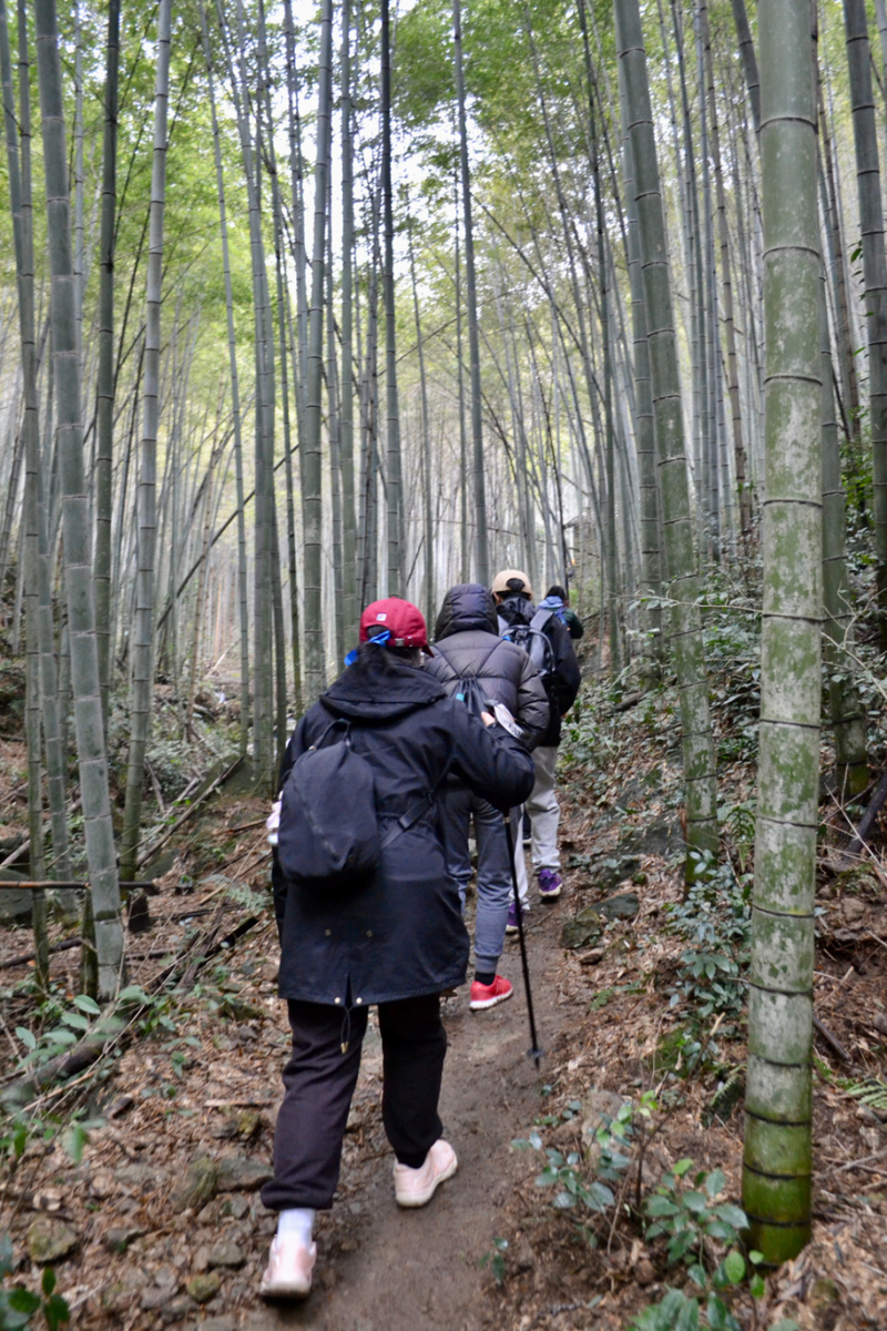 途中,有一段路下山较为陡峭,再加上泥泞的路面让行走变得更加艰难。我们小心翼翼地用登山杖支撑好,一步一步地向下挪动。经过最后一段竹林泥巴路,我们来到曹山古寺,大家在这里调整休息一下。