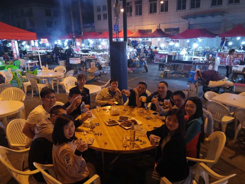 到了桐庐,放下背包,一大伙人就往有烧烤的地方寻去。刚一拐角,哇,这才是真正的大排档嘛,啥啥啥都有,在soso的带领下我们寻了一家就开始点东西。我很贪心的多要了点鸡翅。嘎嘎嘎。他们还聊了些关于政治经济的话题,话题so敏感,我拉着若让和我聊起了悄悄话。哈哈哈哈哈哈。